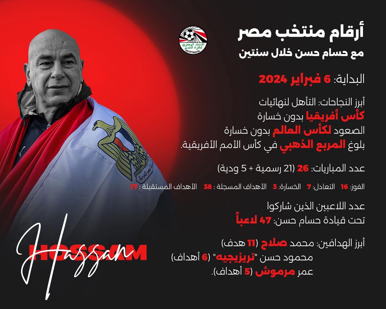 في ذكرى مرور عامين على تولي حسام حسن القيادة الفنية لمنتخب مصر، استعرض الاتحاد المصري لكرة القدم برئاسة هاني أبو ريدة كشف حساب "العميد" وجهازه المعاون، مؤكداً أن النجاح لم يكن وليد الصدفة بل نتيجة عمل جماعي متكامل بدأ منذ السادس من فبراير 2024.