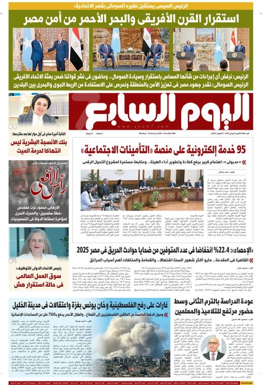 ينشر "اليوم السابع" فى عدده الصادر غدا، تفاصيل هامة حول العديد من الأحداث الجارية على الساحتين الداخلية والخارجية أبرزها: الرئيس السيسى يستقبل نظيره الصومالى بقصر الاتحادية: استقرار القرن الأفريقى والبحر الأحمر من أمن مصر.. الإحصاء: %22.4 انخفاضا فى عدد المتوفين من ضحايا حوادث الحريق فى مصر.. عودة الدراسة بالترم الثانى وسط حضور مرتفع للتلاميذ والمعلمين
