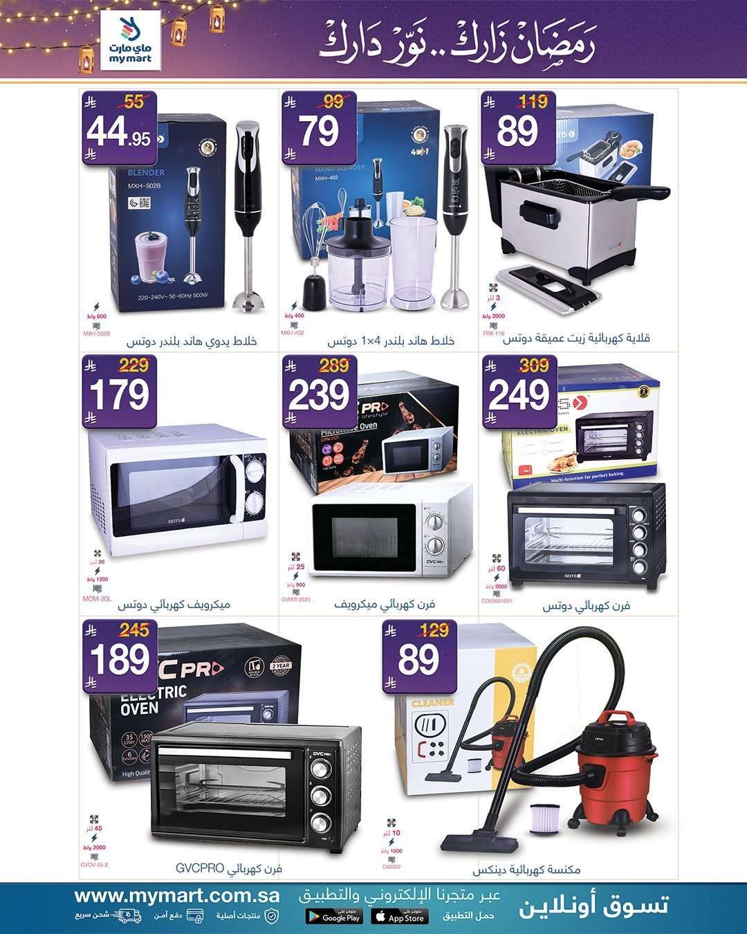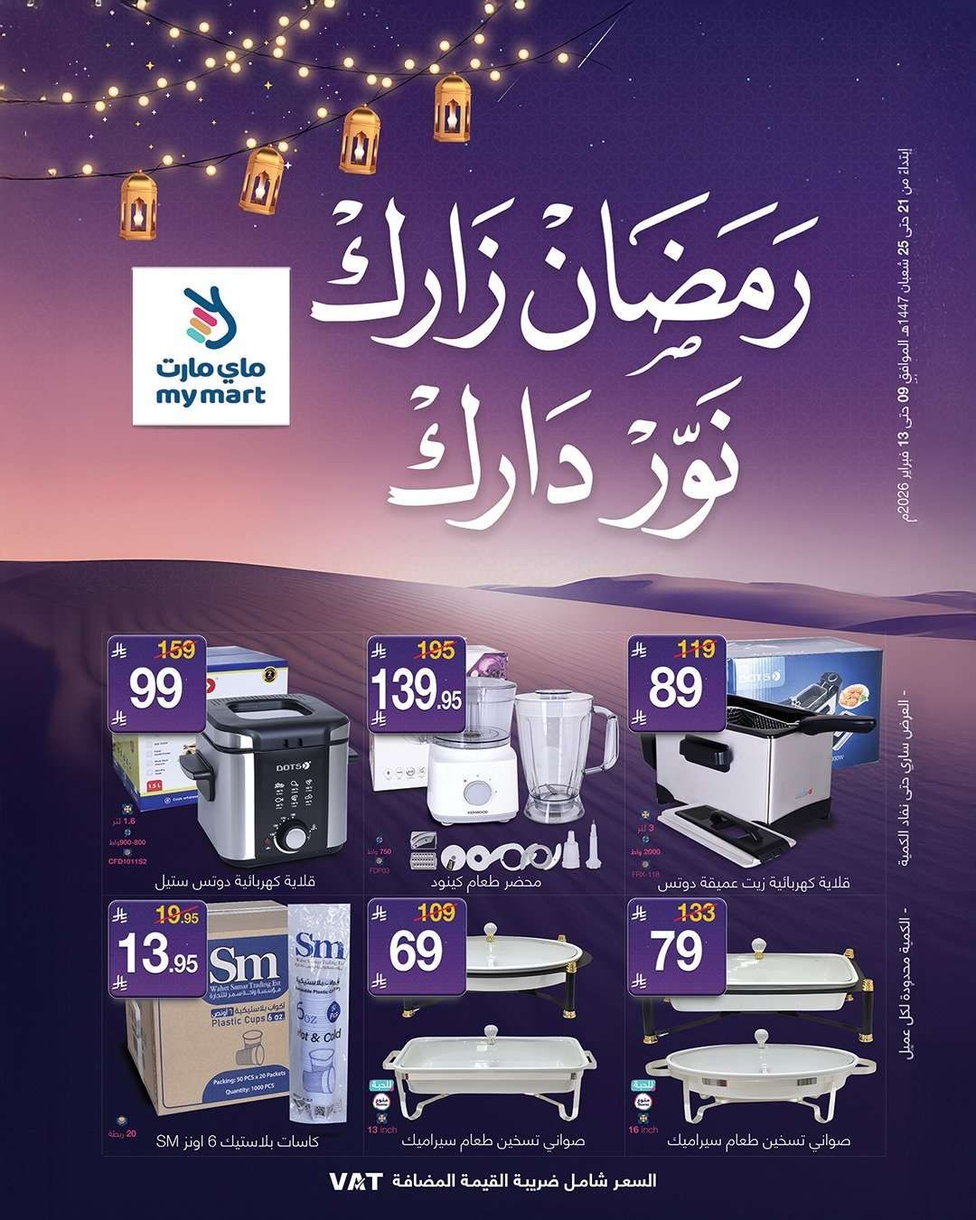 عروض ماي مارت الاسبوعية الاثنين 9 فبراير 2026 الموافق 21-8-1447هـ و تحتوي علي تشمل محضرة طعام وخلاط كهربائي وعجانة وعصارة و مفرمة وخلاط يدوي وقلاية هوائية وقلاية زيت وميكروويف وفرن كهربائي ومكنسة كهربائية وصواني تسخين سيراميك وأكواب بلاستيكية و غيرها من المنتجات و باسعار مميزة في عروض رمضان 2026