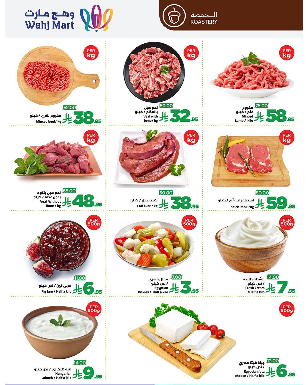 و تشمل ايضا عروض وهج مارت بن وكمون وكاجو وجوز وفواكه مجففة وتشكيلة فاخرة من التمور مثل العجوة والمجدول كما تشمل لحوما طازجة من مفروم وستيك وكبدة عجل ومنتجات الألبان