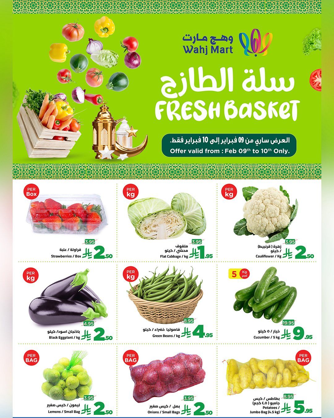عروض وهج مارت جدة الطازج الاثنين 9 فبراير 2026 – 21 شعبان 1447هـ و تحتوي علي الخضروات كالملفوف والزهرة والباذنجان والفاصوليا والبطاطس والبصل والليمون مع فاكهة الفراولة