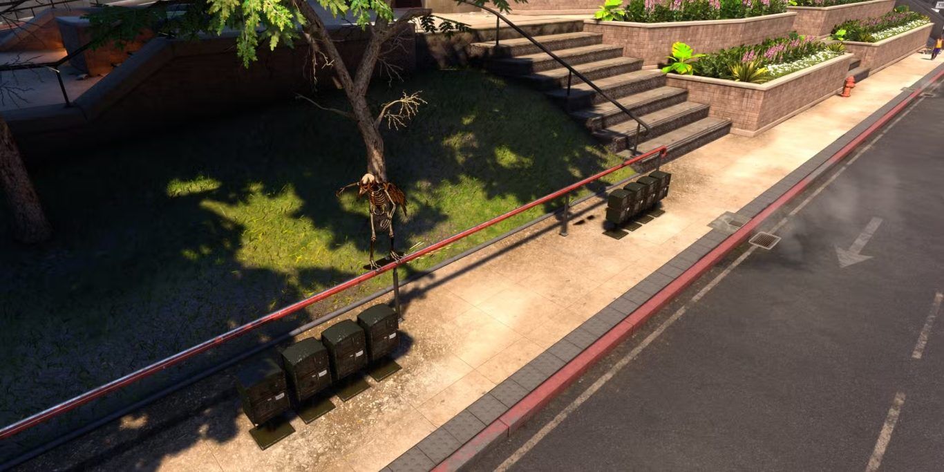 - بعد ذلك، يتم الخروج من المبنى والتزلج باتجاه الطريق، ثم الانعطاف الحاد إلى اليمين. على الرصيف في الجهة اليمنى توجد السكة الحمراء الثانية، ويؤدي تنفيذ Grind عليها إلى إكمال ثاني Quake Rail.