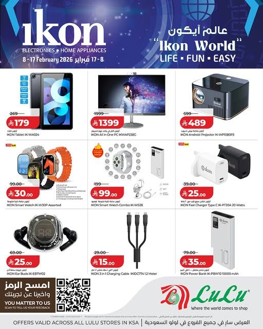 لولو عالم ايكون حتى 17 فبراير 2026 اقوى العروض على الاجهزة الالكترونيه و التقنية و المنتجات المميزه في جميع اسواق لولو ضمن الفروع المنتشره في المملكة العربية السعودية و العرض ساري من 8 حتى 17 فبراير 2026 لا تفوتوا افضل العروض المميز