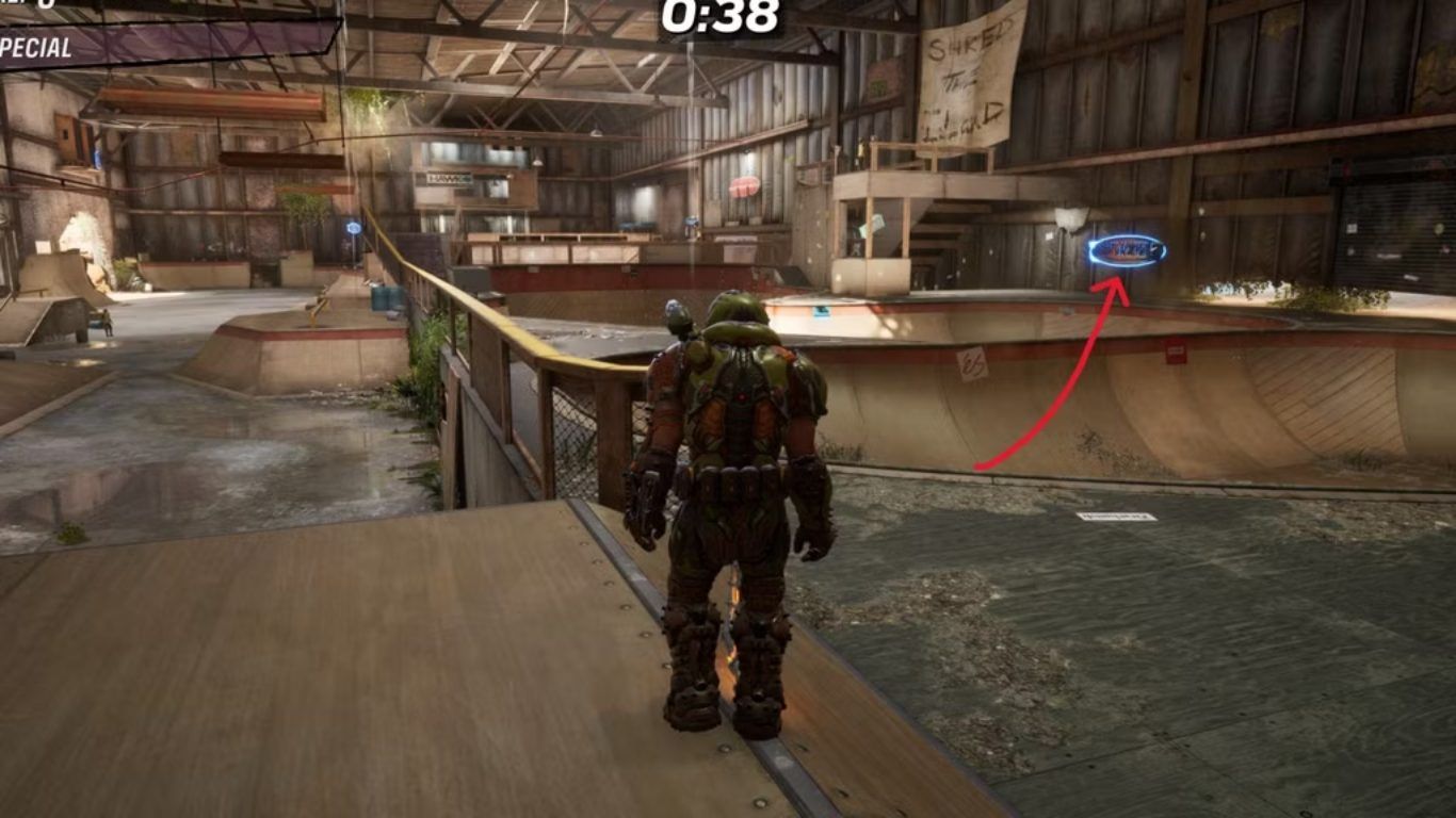 يتم الانطلاق من نقطة الظهور ثم التوجه يمينًا إلى حوض التزلج، حيث يمكن للاعبين استخدام حركة قفز لالتقاط أول نقطة إحصائيات. - نقطة الإحصائيات رقم 2