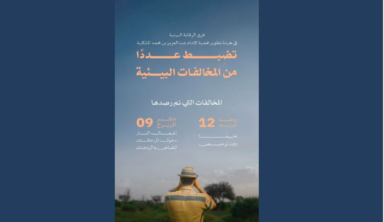 ضبطت هيئة تطوير محمية الإمام عبدالعزيز بن محمد الملكية، ممثلةً بفرق الرقابة البيئية، (12) مخالفة بيئية في روضة خريم تمثلت في التخييم غير المصرح به، وضبط (9) مخالفات أخرى في كسر المزيرع تمثلت في إشعال النار، ودخول المركبات والسيارات إلى الفياض والروضات البرية المحمية.