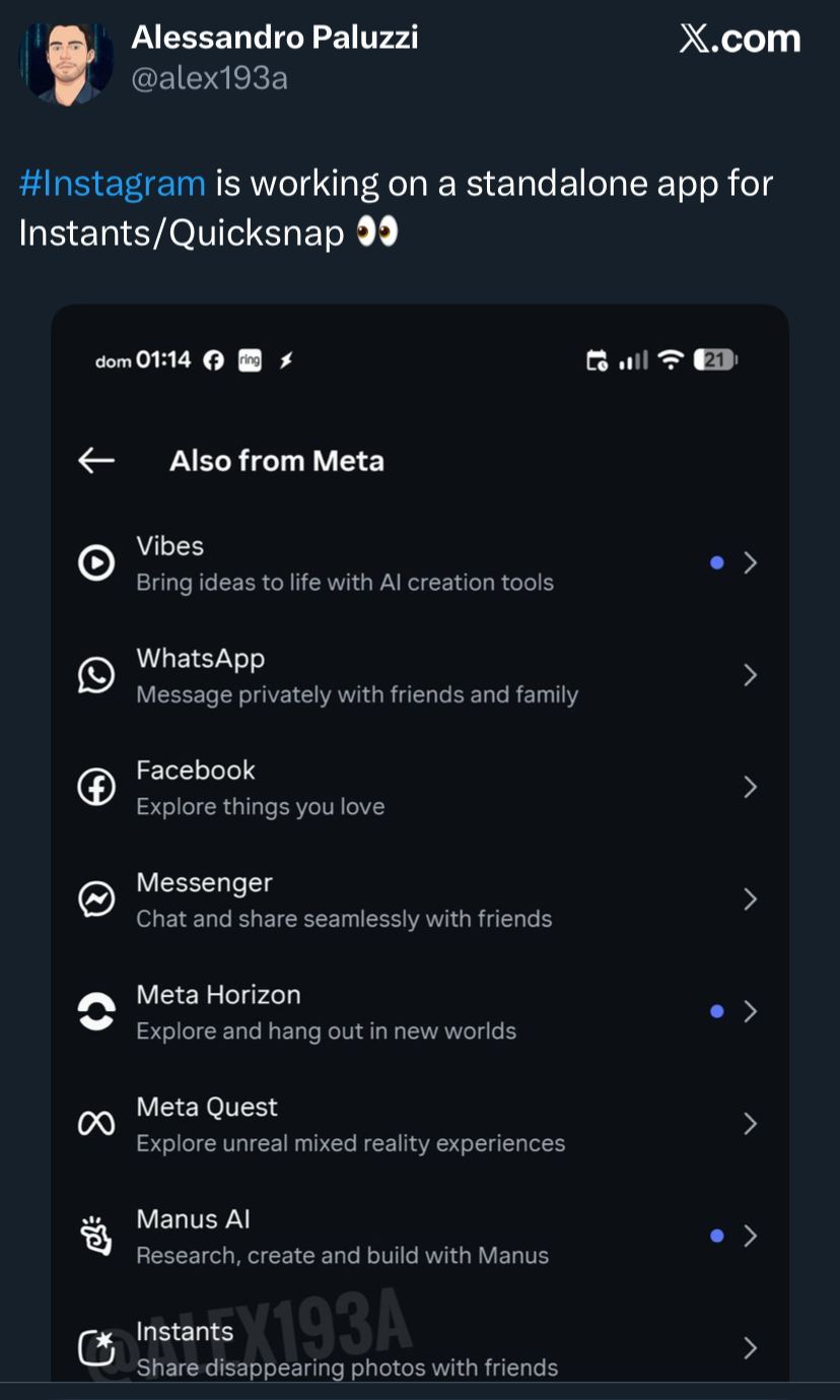 إلى جانب التطبيق المستقل، أكد متحدث ميتا أيضًا أن إنستجرام يختبر ميزة جديدة تحمل اسم Instants، وكانت هذه الميزة تُعرف سابقًا باسم Shots، وهي متاحة حاليًا ضمن اختبار محدود في “بعض الدول حول العالم”.