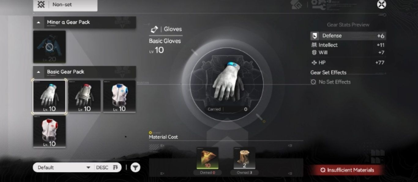 في المراحل الأولى يعتمد اللاعب على مواد بسيطة يتم جمعها بسهولة من البيئة المحيطة أو من الإنتاج الأساسي داخل القاعدة وهو ما يسمح بتصنيع Gear مبدئي يساعد على اجتياز المحتوى المبكر دون الحاجة إلى بنية صناعية معقدة.