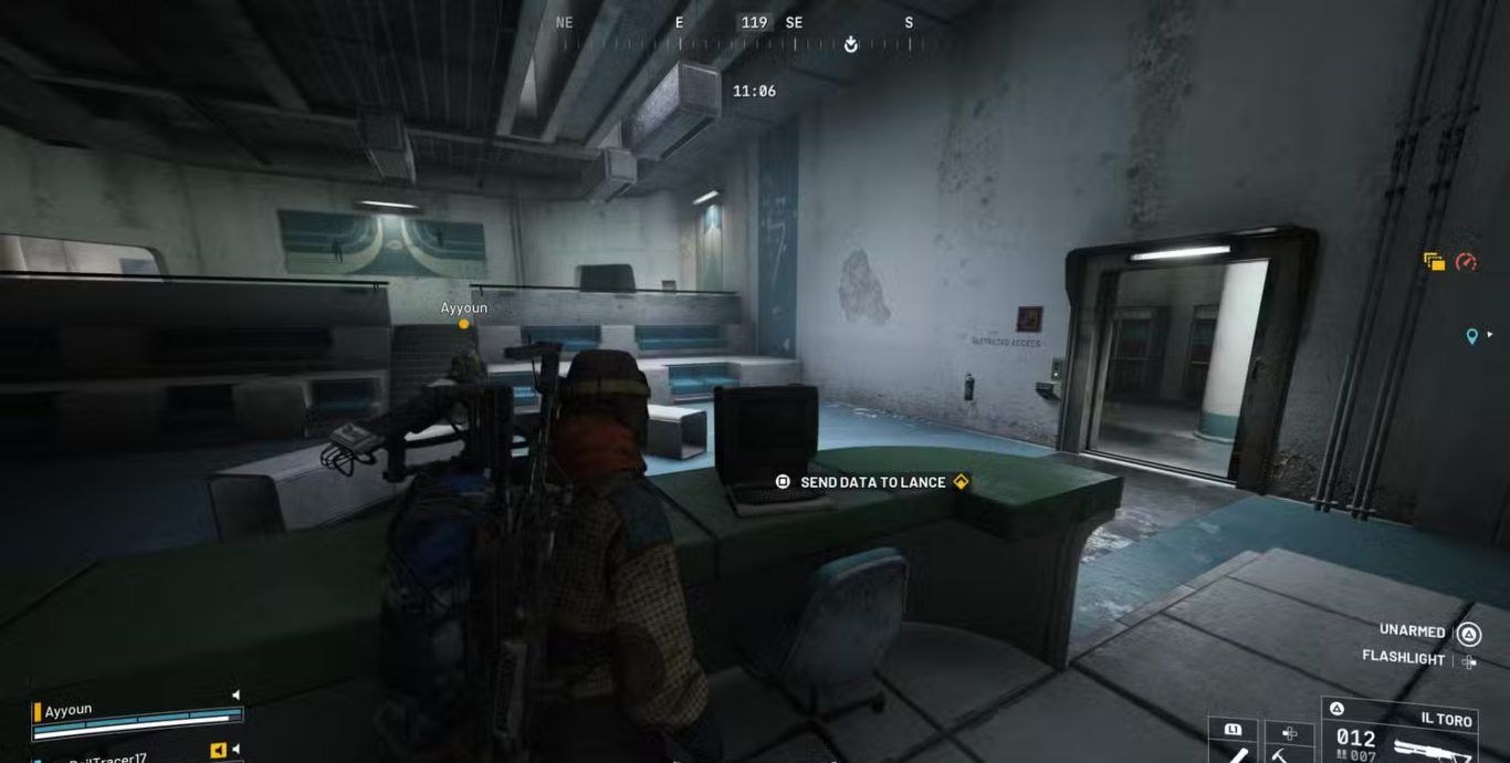 أثناء التقدم إلى داخل المبنى سيلاحظ اللاعب وجود جهاز كمبيوتر آخر يقع على الجهة اليمنى من المسار الرئيسي حيث يعد هذا الجهاز جزءا أساسيا من تسلسل أهداف المهمة.