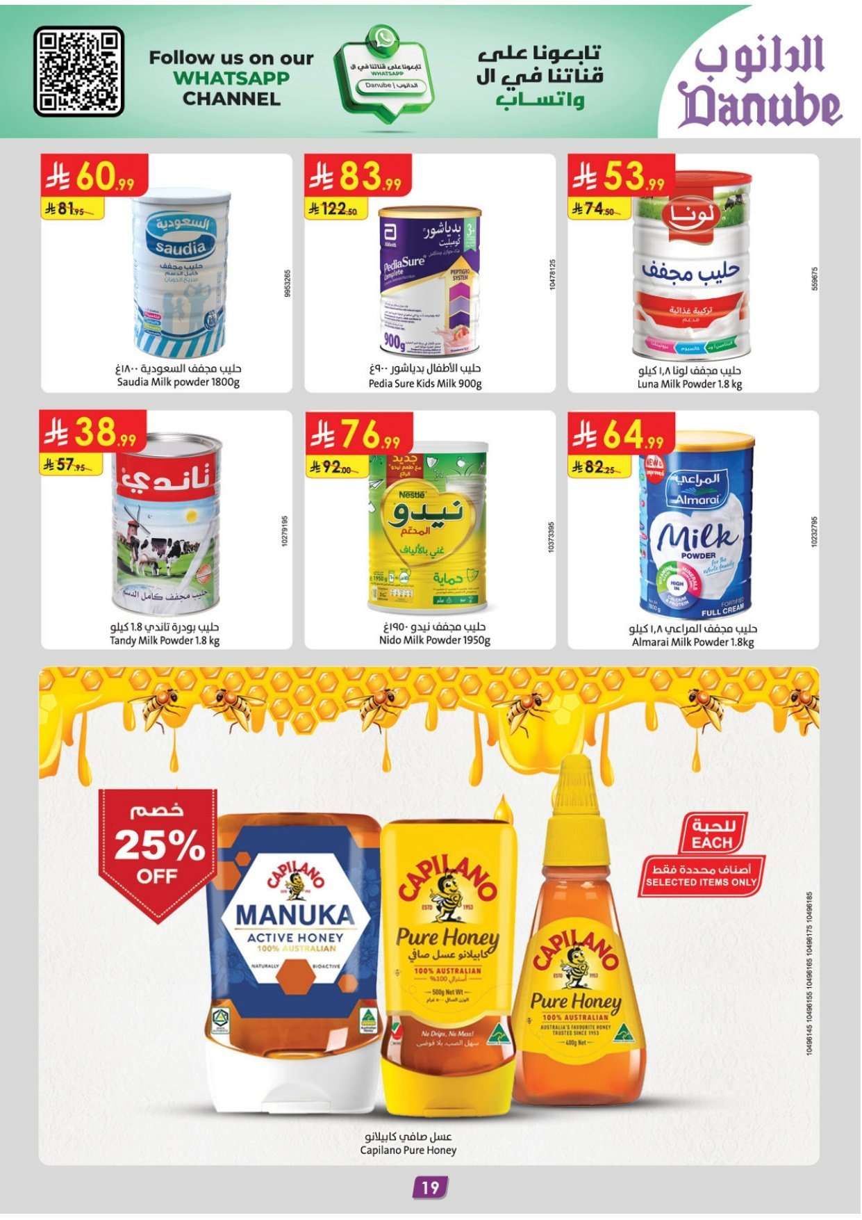 و تقدم ايضا عروض الدانوب الاحساء اليوم المنتجات الغذائية منها التمر الصقعي وقطع الأرانب المجمدة وشاي أخضر بالنعناع وبهارات الكبسة والملح الخشن والبطاطس والليمون الأخضر والبرتقال المصري والدجاج