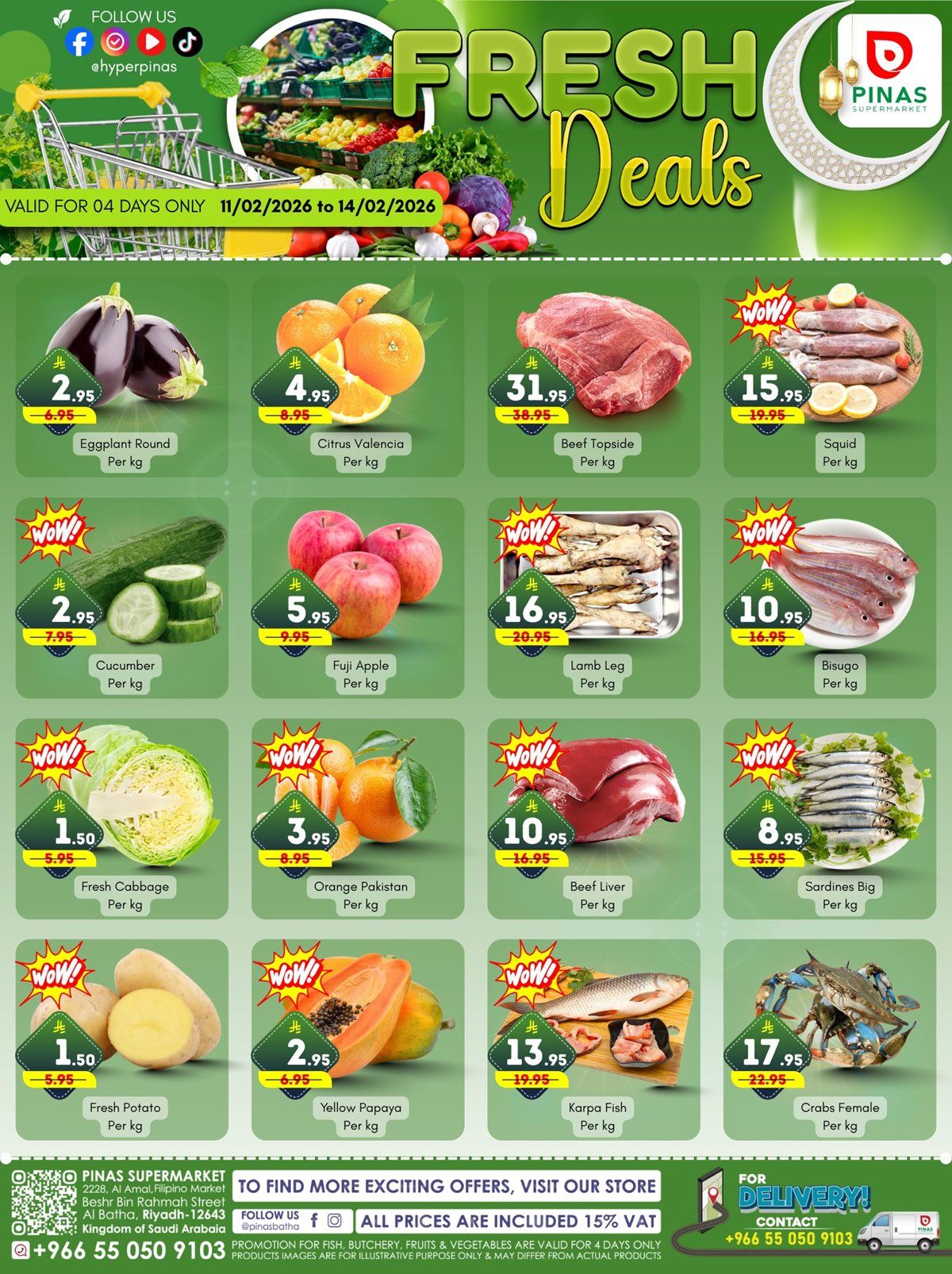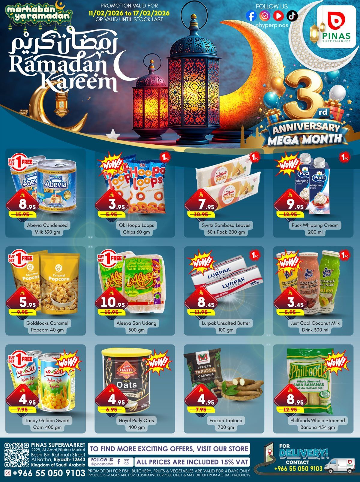 عروض بيناس الرياض الأربعاء 23 شعبان 1447هـ الموافق 11-2-2026 تشمل المواد الغذائية الخبز عسل السدر اللحم المحلي الفاكهة الموسمية الأجبان السمن القهوة التمور الخضروات اللحم المبرد الدجاج والأرز والسكر