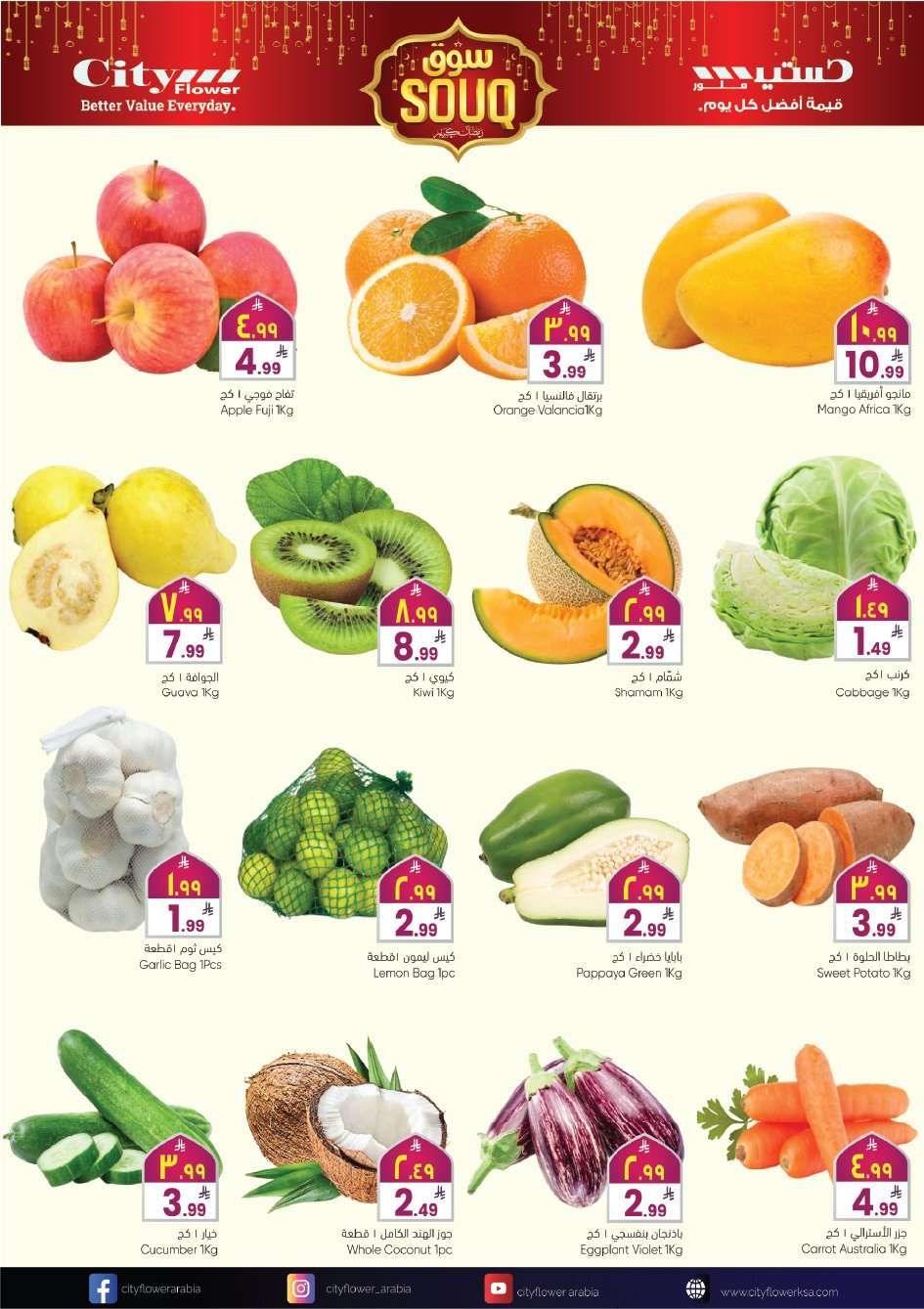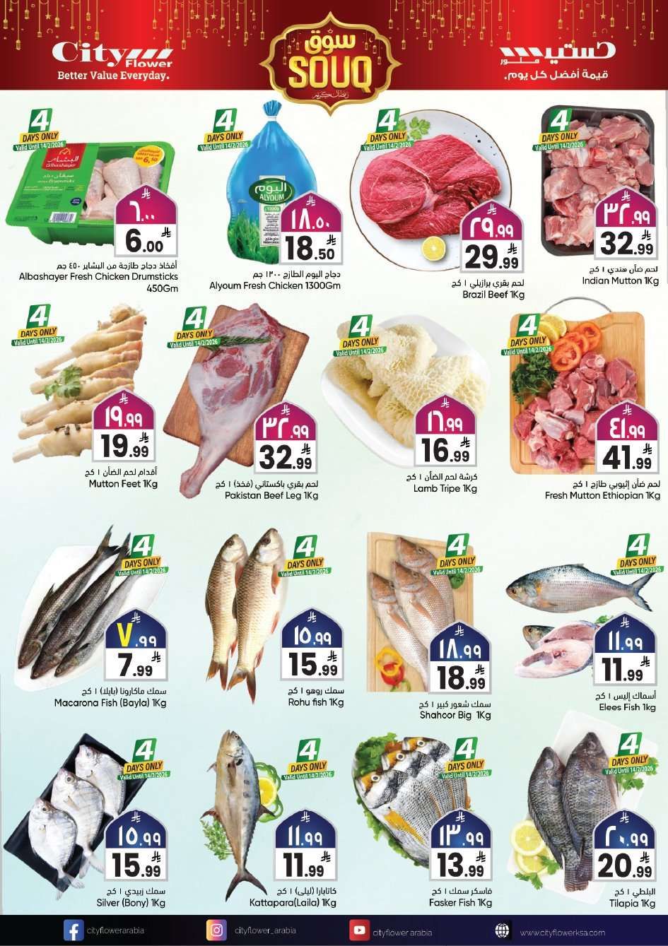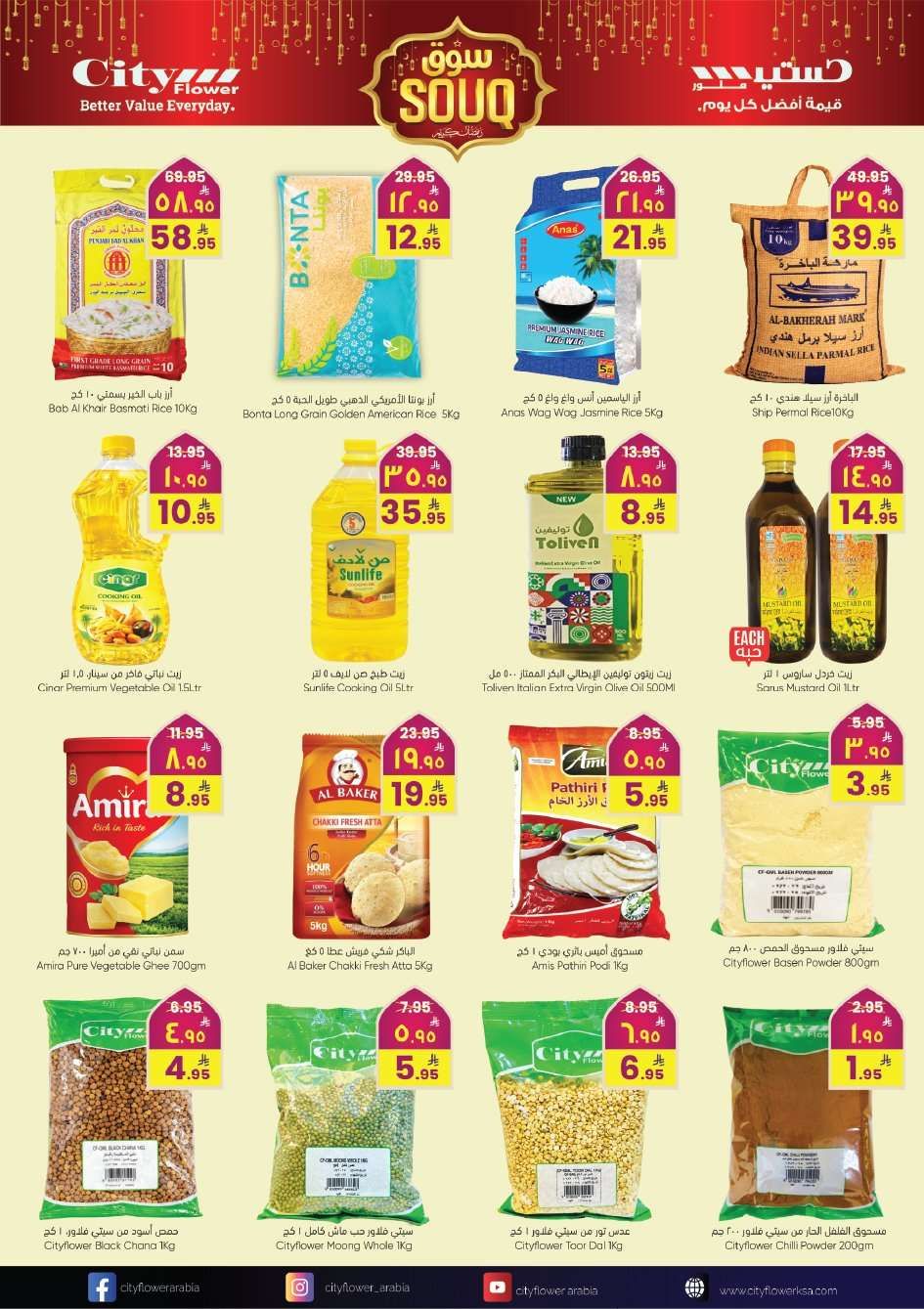 و تشمل ايضا سيتي فلور الرياض علي تشكيلة من المنتجات الغذائية منها اللحم البقري المفروم عصائر بسكويت الشاي الجبن الأبيض الأرز الهندي السكر الدقيق القهوة التمور الصلصات الدجاج والعدس