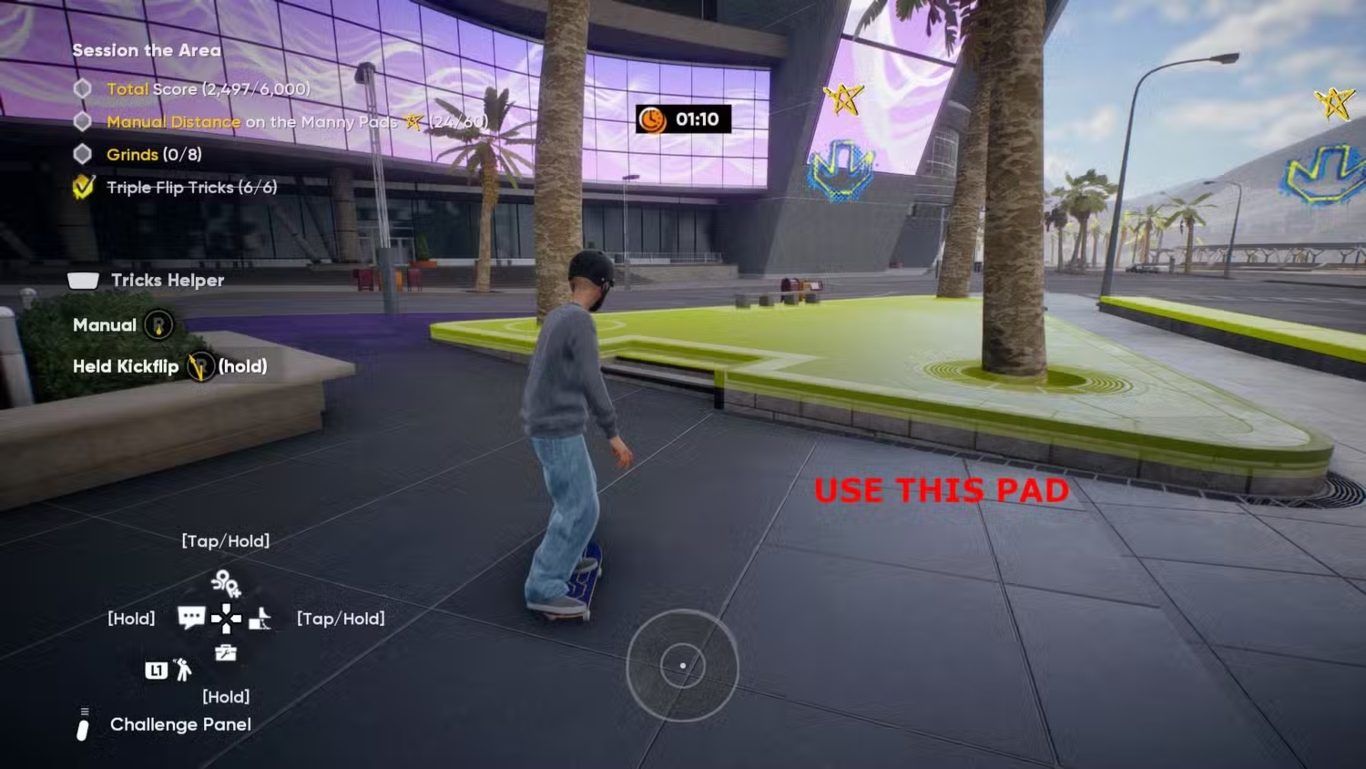 يتطلب هذا الهدف من اللاعبين تنفيذ ثماني حركات Grind كاملة. تُعد حواف منصات Manny Pads من أفضل الأماكن المناسبة لتنفيذ هذا النوع من الحركات، حيث توفر سطحًا مستقرًا وحافة واضحة تساعد على بدء الـGrind بسهولة.