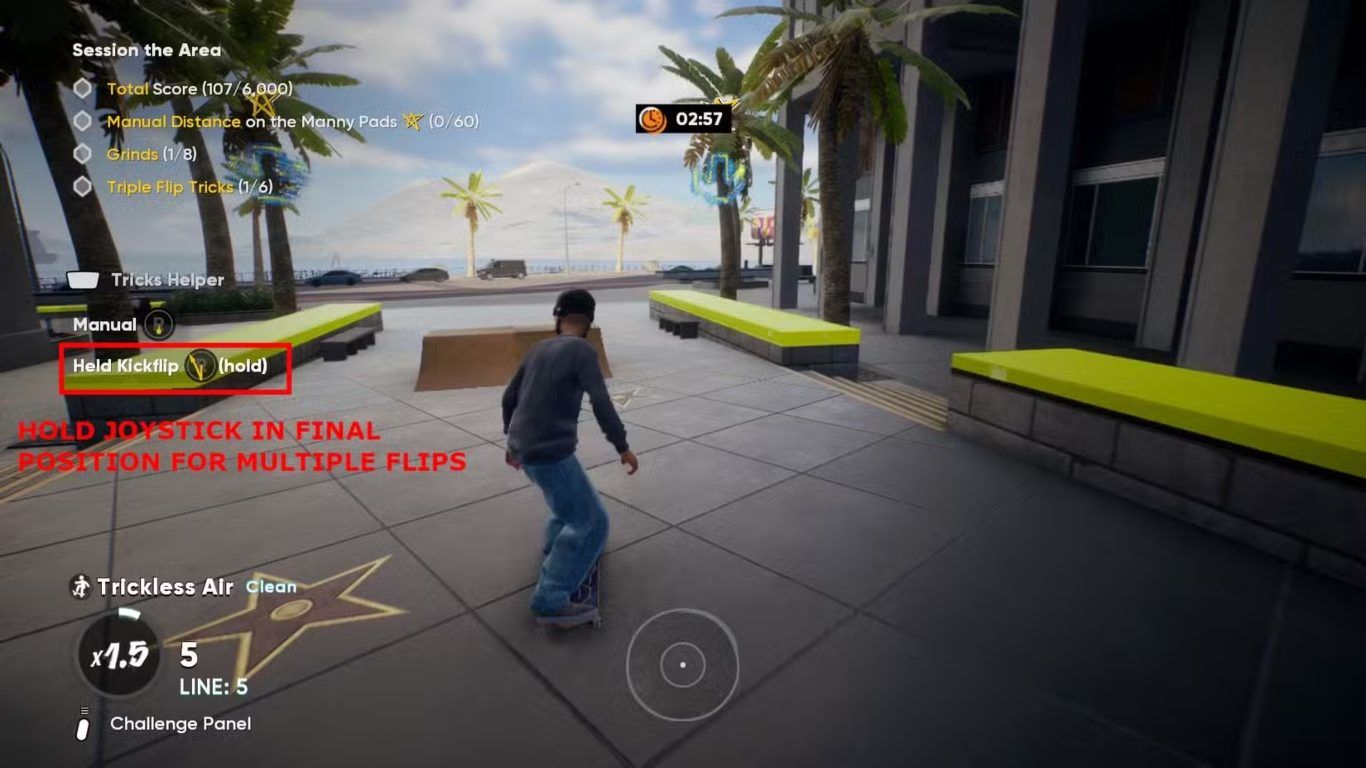 يمكن للاعبين تحويل أي حركة Flip إلى Triple Flip ببساطة من خلال الاستمرار في الضغط على عصا التحكم اليمنى في الوضعية النهائية للحركة، إلى أن يُكمل اللوح ثلاث دورات كاملة. وبناءً على ذلك، يمكن استخدام حركات أخرى غير الكيك فليب، مثل Heelflip أو Pop-Shuvit، إذا كانت أسهل أو أكثر راحة للاعب، لإتمام هذا الهدف