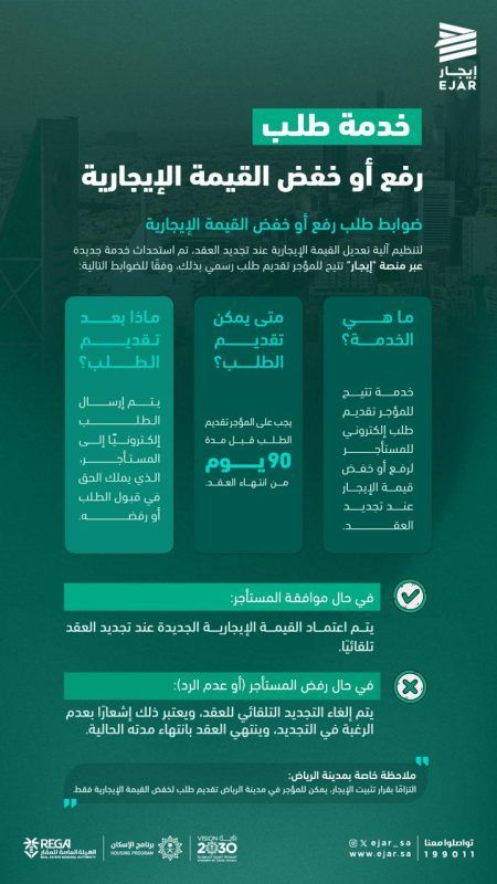 وقالت عبر منصة إكس إن الخدمة تُمكّن المؤجر من تقديم الطلب قبل 90 يومًا من نهاية العقد، ليُرسل إلكترونيًا إلى المستأجر، الذي يملك خيار القبول أو الرفض.