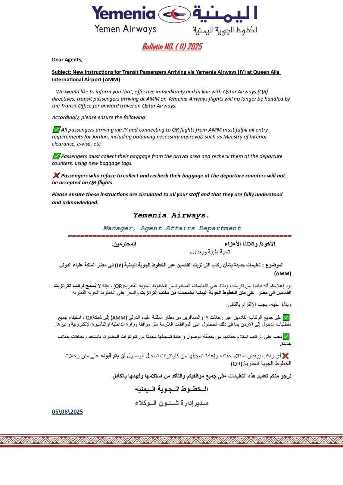 اصدرت شركة طيران الخطوط الجوية اليمنية تنويه هام بشأن ركاب الترانزيت القادمين الى مطار الملكة علياء الدولي