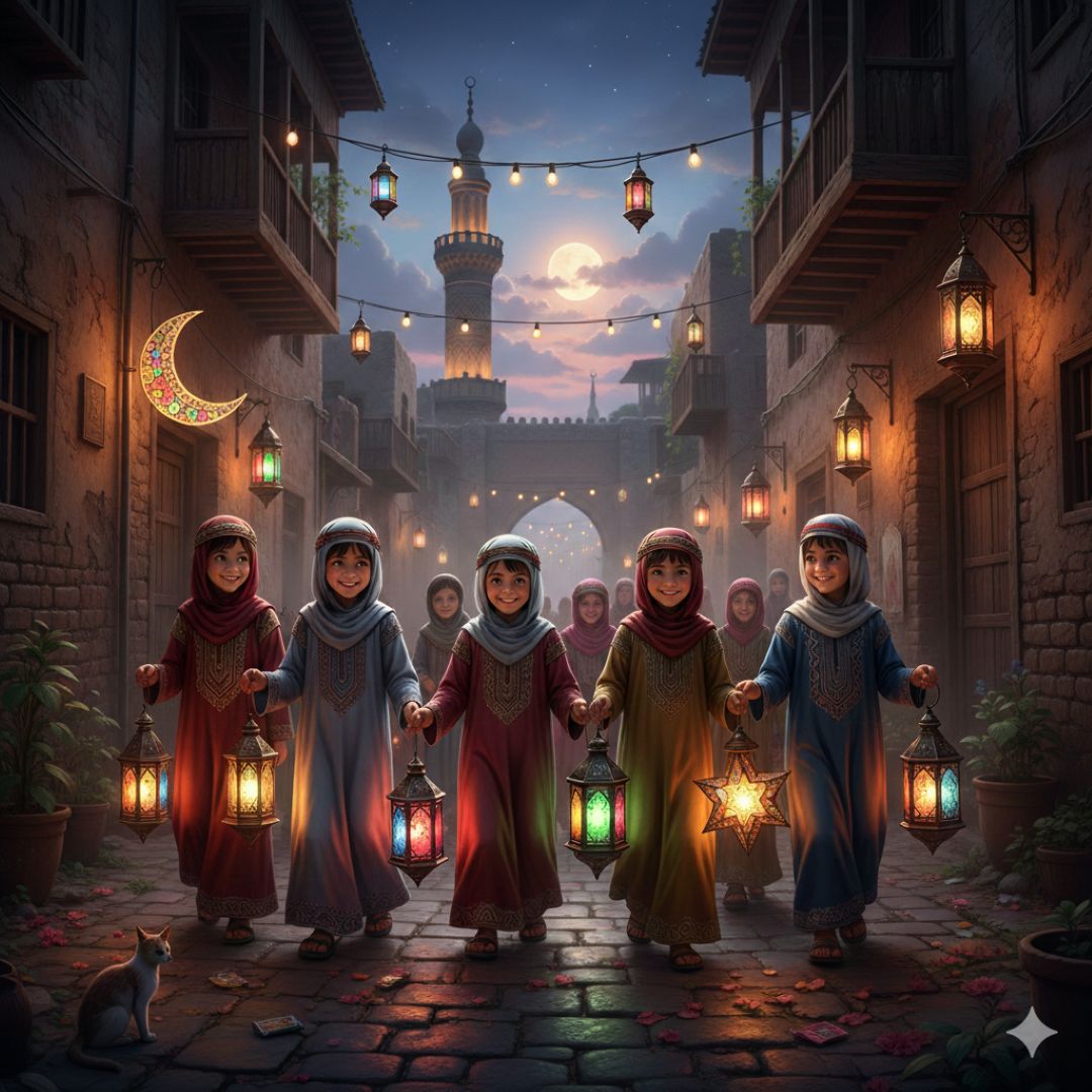في حي صغير تغطيه ألوان المساء الذهبية مع نسيم شهر رمضان العليل، كان الطفل سليم يجلس على أريكته بالقرب من نافذة غرفته، ممسكاً بفانوسه الصغير الذي اشترته له والدته قبل أيام من حلول الشهر الفضيل. كان الفانوس مصنوعاً من الزجاج الملون والخشب الخفيف، ويصدر ضوءاً دافئاً حين تُشعل فيه شمعة صغيرة، لكنه لم يكن مجرد لعبة بالنسبة لسليم؛ بل كان رمزاً لما يعنيه شهر رمضان بالنسبة له: فرح العائلة، صوت الأذان، رائحة الطعام، وروح المشاركة التي تملأ الحي.