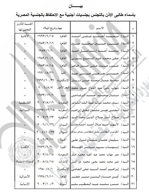 الخميس، 12 فبراير 2026 10:08 صنشرت الجريدة الرسمية، قرار وزير الداخلية رقم 135 و 136 لسنة 2026، بشأن منج الجنسية الاجنبية لـ 42 مصريا مع احتفاظهم بالجنسية المصرية، وذلك استنادًا إلى القانون رقم 26 لسنة 1975.