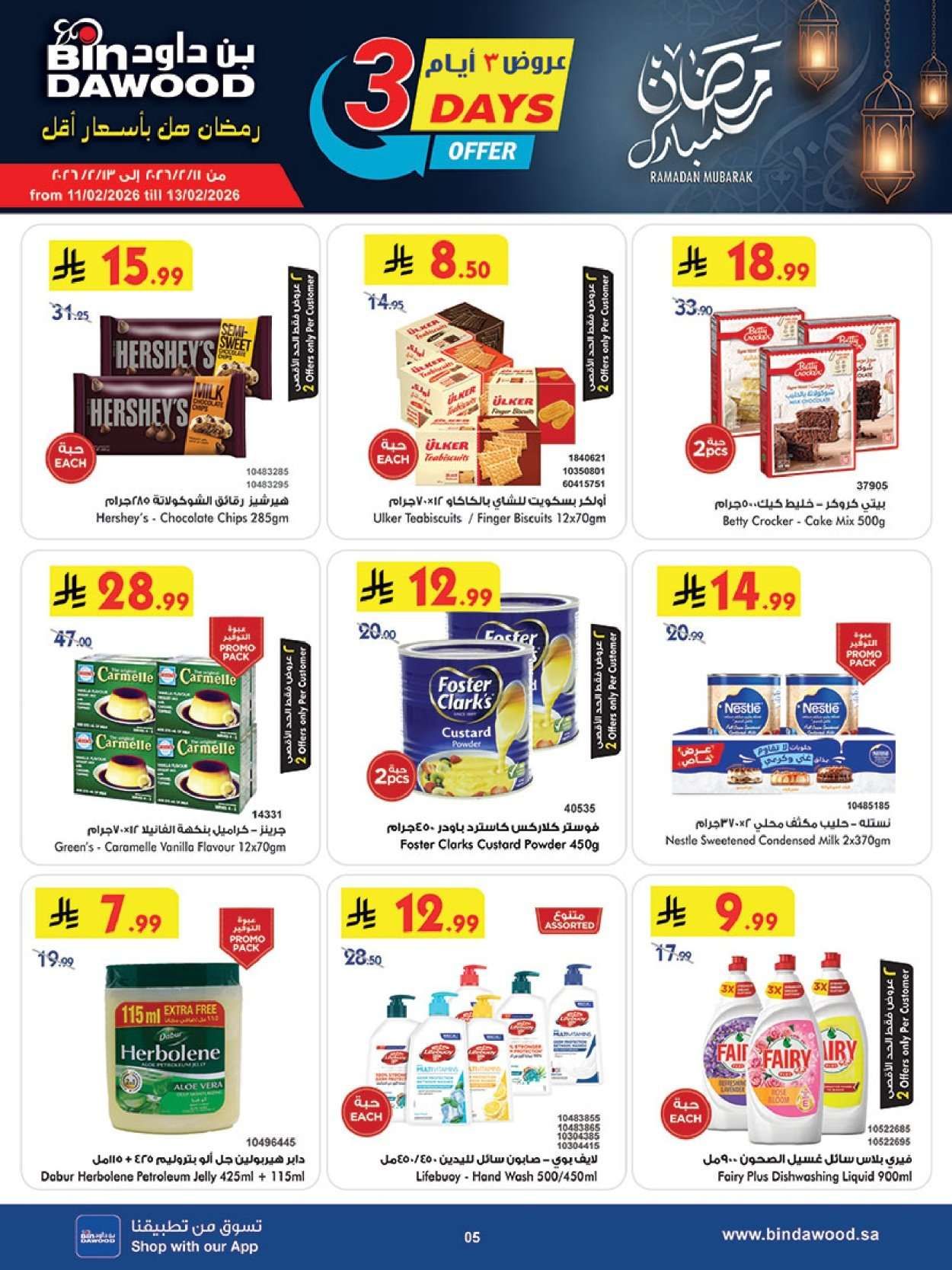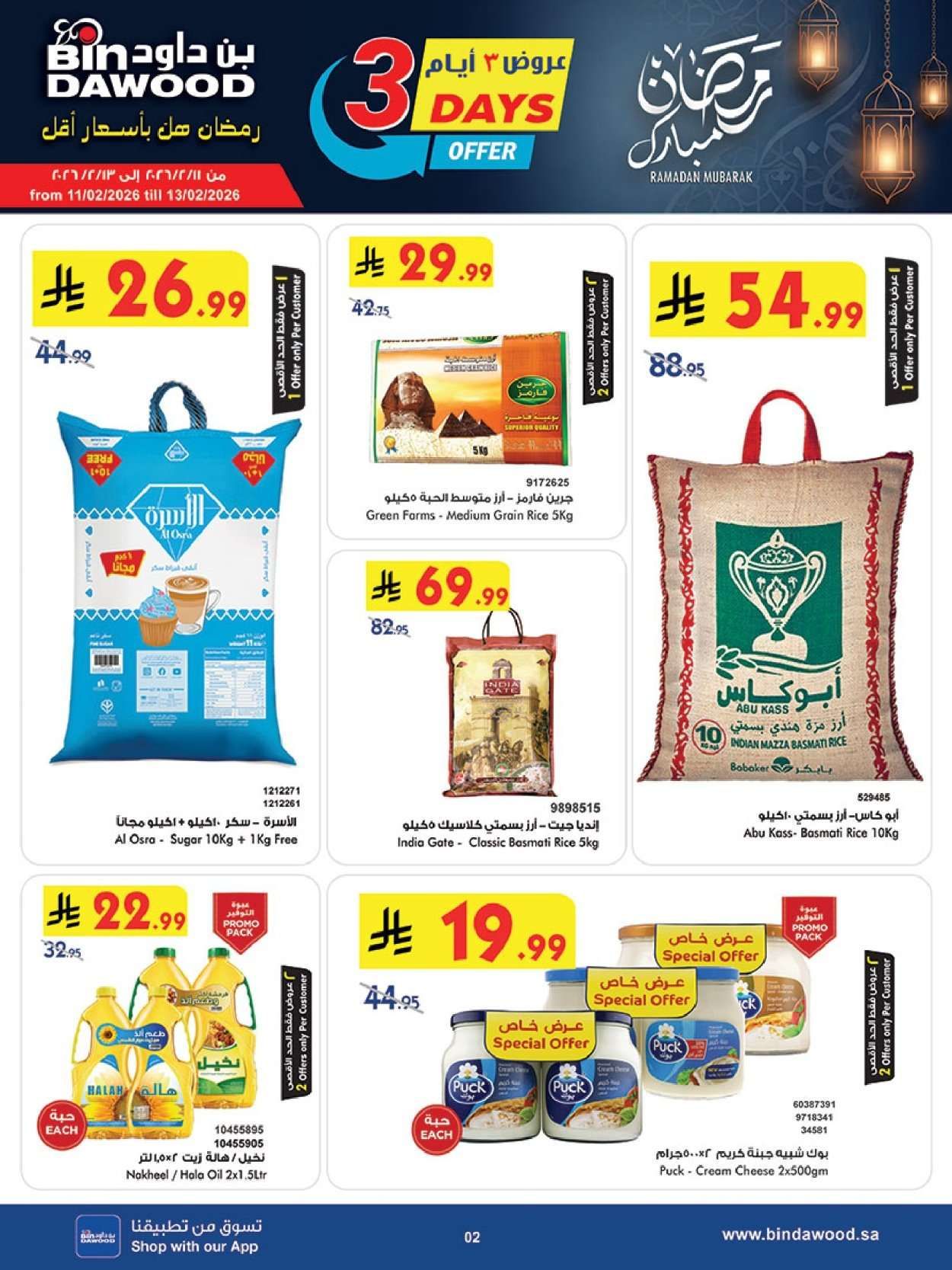 عروض بن داود مكة المكرمة الخميس 12 فبراير 2026 تشتمل على اللحم البقري المكعبات وسمك الهامور المبرد وجبن الموزاريلا الطبيعي والزيتون اليوناني الأسود وأرز البخاري والسكر البني ودقيق الشعير