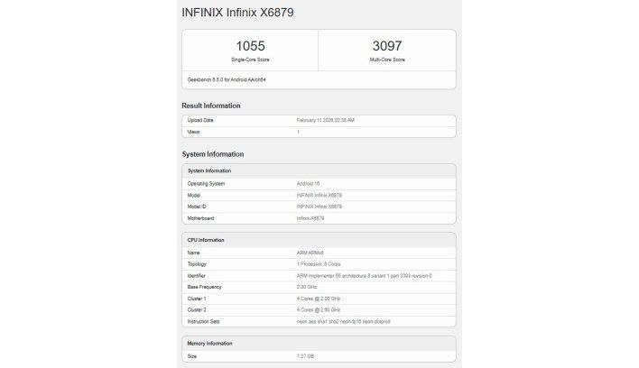 يعمل الهاتف بنظام اندرويد 16 مع واجهة XOS 16 التي كشفت عنها Infinix حديثًا. ووفقًا لنتائج Geekbench 6.5 لنظام اندرويد، سجل الهاتف 1,055 نقطة في اختبار النواة الواحدة و3,097 نقاط في اختبار الأنوية المتعددة.