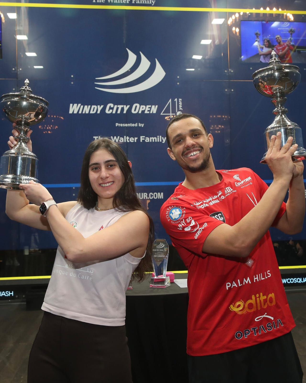 الخميس، 12 فبراير 2026 10:36 صتوج الثنائي المصري، مصطفى عسل المصنف الأول عالمياً لرجال الاسكواش، ونور الشربيني المصنفة الخامسة عالمياً لسيدات الاسكواش، ببطولة ويندي سيتي للاسكواش، التي أقيمت في شيكاغو الأمريكية خلال الفترة بين 5 إلى 12 فبراير الجاري، بقيمة جوائز مادية تصل إلى 220 ألف دولار للرجال ومثلهم للسيدات، بما يضعها في فئة البطولات البلاتينيوم.