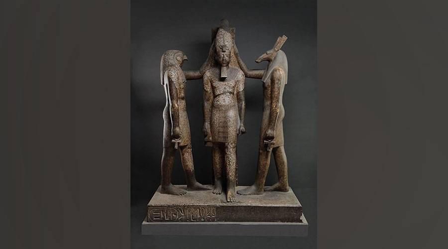 يعرض المتحف المصري بالتحرير، تمثالاً من الجرانيت الأحمر يصور الملك رمسيس الثالث في لحظة مهيبة، يتوسط اثنين من أعظم «معبودات» مصر القديمة.