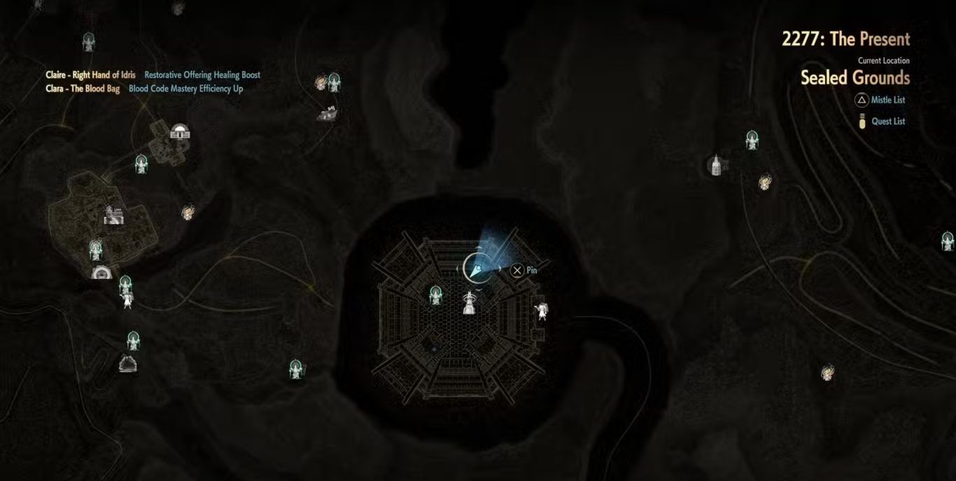 | Sealing Grounds Tower 2 | بعد العودة إلى Sealing Grounds في الماضي يجب التوجه إلى Upper Floor ثم متابعة التقدم حتى الوصول إلى Lever بالقرب من نهاية المنطقة وبعد تفعيله تفتح الأبواب المؤدية إلى Tower of Regeneration والذي يمكن الوصول إليه من الغرفة المركزية |