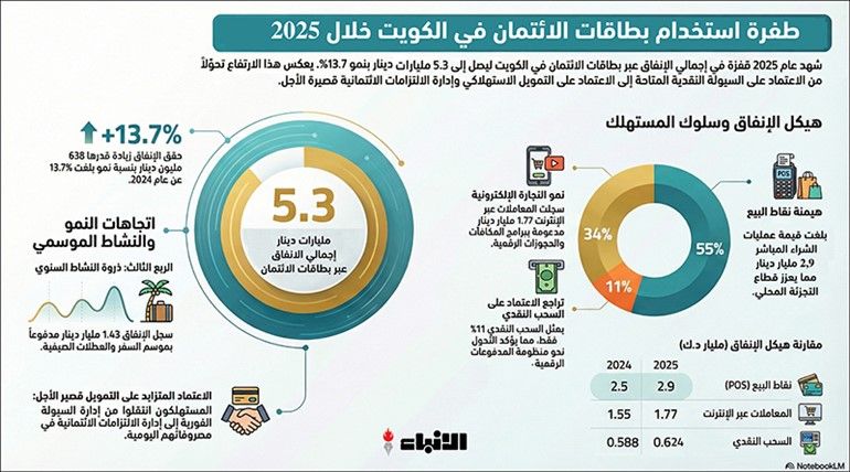 سجل إجمالي استخدام بطاقات الائتمان المقومة بالدينار خلال عام 2025 نحو 5.3 مليارات دينار، مقارنة بنحو 4.6 مليارات دينار في 2024، بزيادة تقارب 638 مليون دينار ونمو يبلغ 13.7%، ويمثل هذا المستوى من الإنفاق الائتماني قيمة الالتزامات المالية الناتجة عن استخدام هذه البطاقات، ما يعني أن الكويتيين والمقيمين أصبحوا مدينين بهذه المبالغ عمليات الشراء المنفذة عبرها، ويعكس هذا الرقم وزنا متزايدا للتمويل قصير الأجل داخل الدورة الاستهلاكية، كما يشير إلى اتساع دور الائتمان في تمويل الطلب المحلي وتدوير السيولة داخل الاقتصاد، كما أن هذا المستوى من الالتزامات يعكس ارتفاع متوسط استخدام البطاقة للفرد، وهو مؤشر على تزايد اعتماد المستهلكين على التمويل الاستهلاكي في إدارة مصروفاتهم اليومية بدلا من الاعتماد الكامل على السيولة المتاحة.