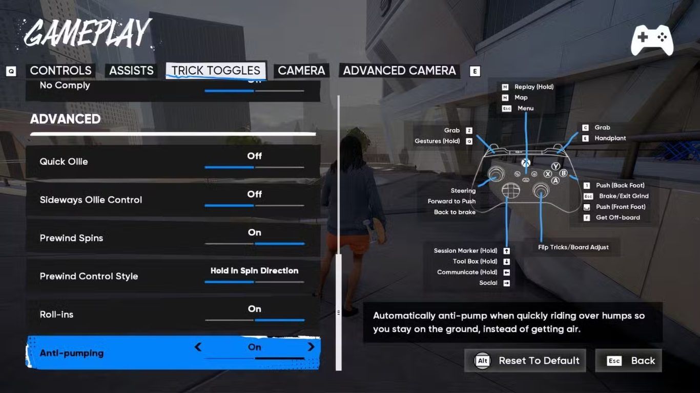 تسهّل هذه الخيارات الحفاظ على السرعة على المنحدرات دون مجهود كبير. اعثر عليها في قائمة Gameplay ضمن تبويبات مثل Controls، Assists، Trick Toggles وغيرها. ارفع قيمة Vert Pump Assist إلى 100 لتحصل على قوة Pump أكبر.