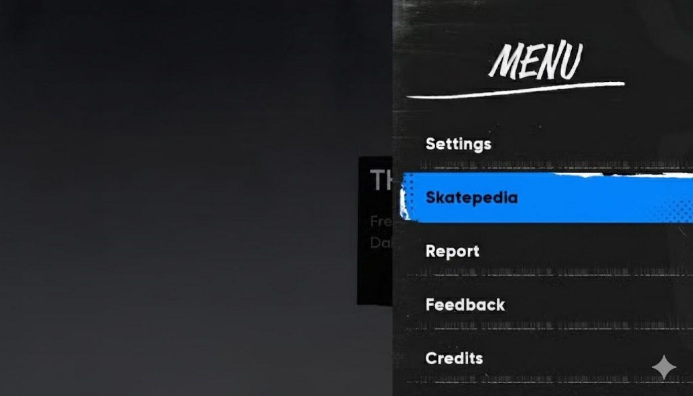افتح Skatepedia عبر الضغط على ESC، ثم اخترها من القائمة المنسدلة، وستحصل على إمكانية الوصول إلى قائمة الحركات الكاملة. يفيد الاطلاع على الحركات قبل خوض التحديات أو أهداف AR Program، حتى إذا لم يتم التقدم كثيرًا في القصة بعد.