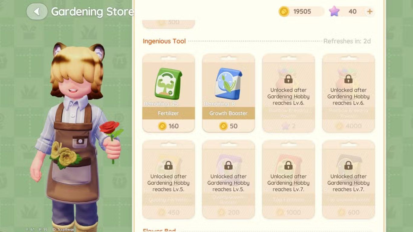 أما Top Fertilizer فيتم فتحها عند الوصول إلى المستوى 7 في Gardening ويتم بيعها بسعر 1000 Gold لكل كيس وتعد الخيار الأعلى كفاءة للاعبين الذين يسعون لتحقيق أقصى إنتاجية وجودة ممكنة من محاصيلهم.