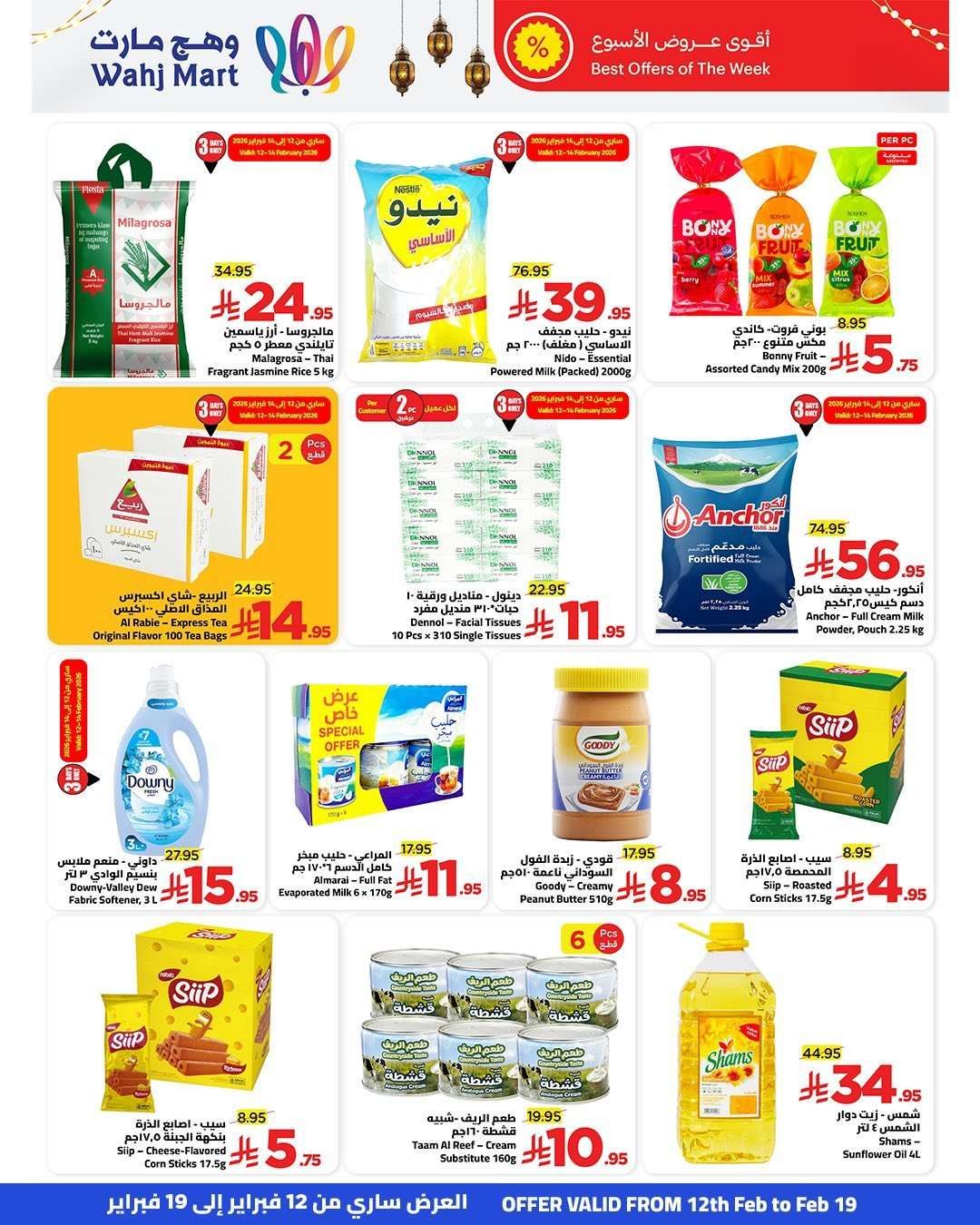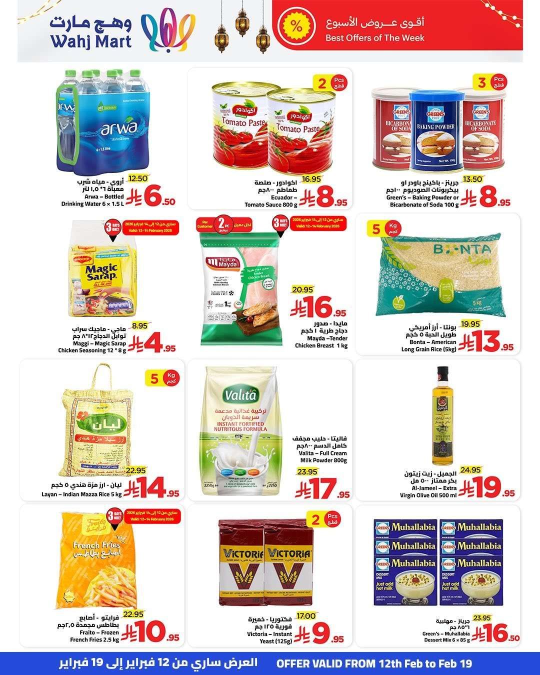 نقدم لكم احدث عروض وهج مارت جدة الاسبوعية السبت 14-2-2026 الموافق 26 شعبان 1447هـ تشمل تشكيلة واسعة من الأرز والزيوت والحليب المجفف والسائل والمجمدات كالخضروات والدجاج