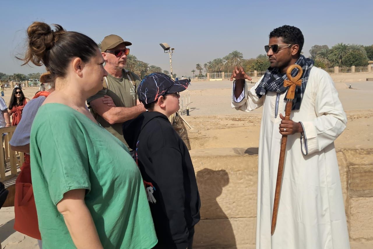 سياح فرنسيون بمعابد الكرنك يقدمون التهنئة للشعب المصري بقدوم شهر رمضان