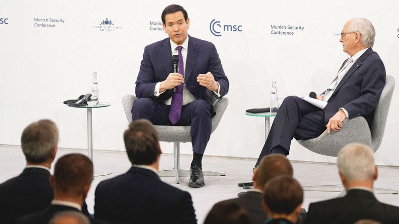 وقال روبيو موجهاً حديثه لرؤساء الدول والحكومات في قاعة فندق «بايريشير هوف» بمدينة ميونيخ الألمانية، أمس: «مصيرنا كان ولايزال مرتبطاً بمصيركم على نحو غير قابل للانفصال»، وأضاف الوزير الأميركي أنه في «وقت تعلن فيه عناوين الأخبار نهاية الحقبة العابرة للأطلسي»، ينبغي أن يكون واضحاً للجميع أن ذلك ليس هدف الولايات المتحدة ولا رغبتها.