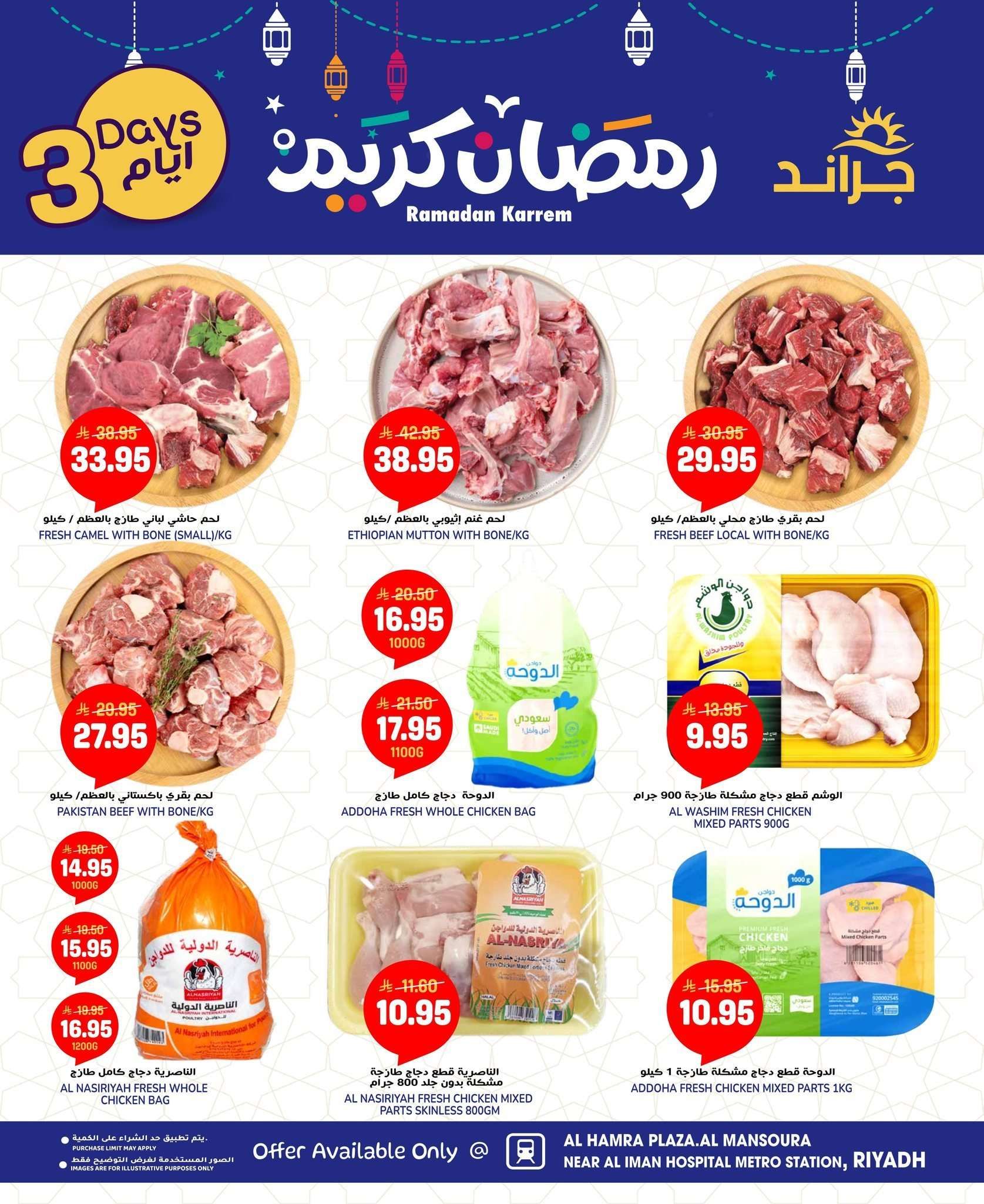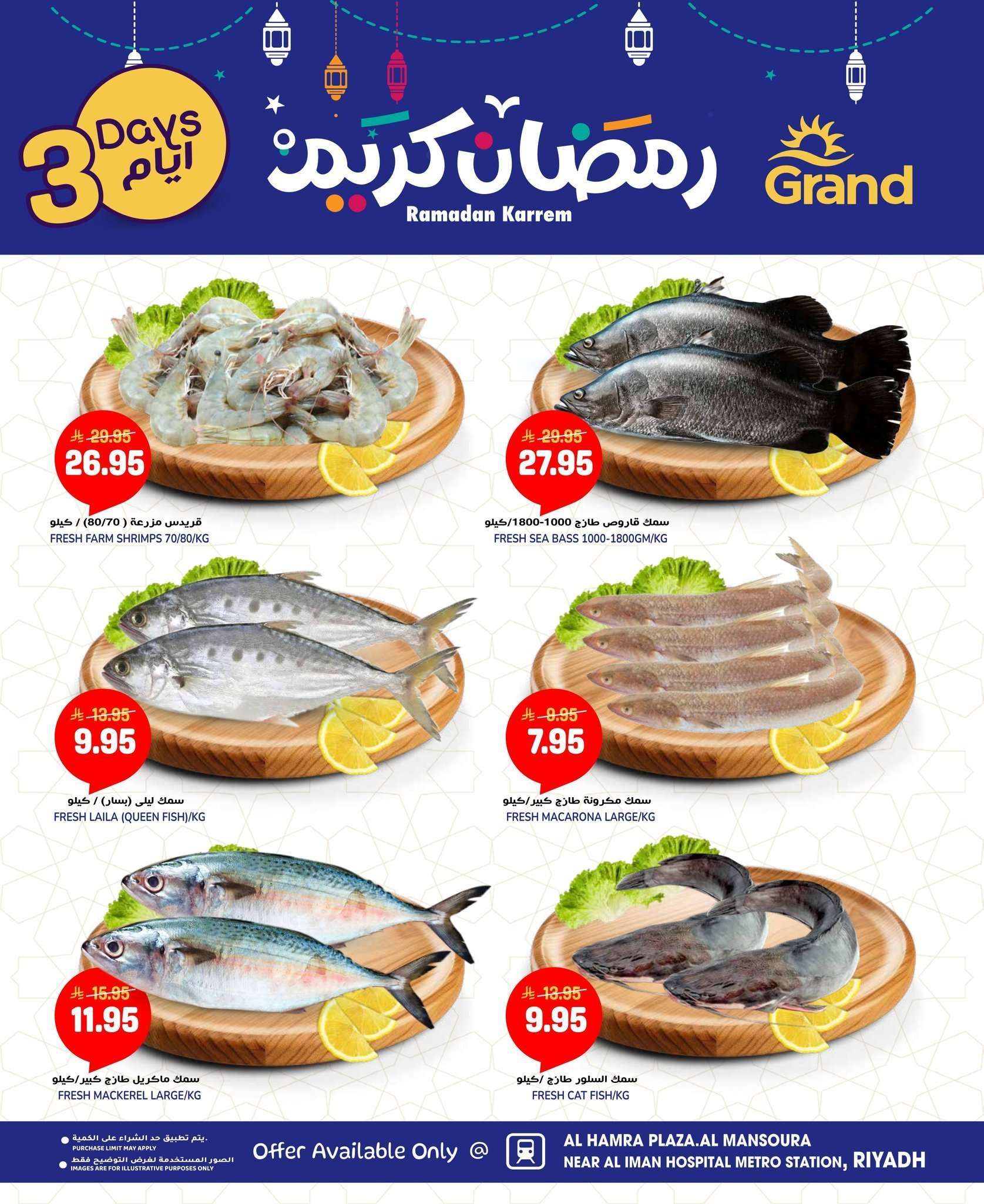 عروض جراند هايبر الرياض الطازج الاحد 15-2-2026 الموافق 27 شعبان 1447هـ تشكيلة من اللحوم الحمراء كالغنم والحاشي والدواجن المبردة والمجمدة والأسماك الطازجة بمختلف أنواعها