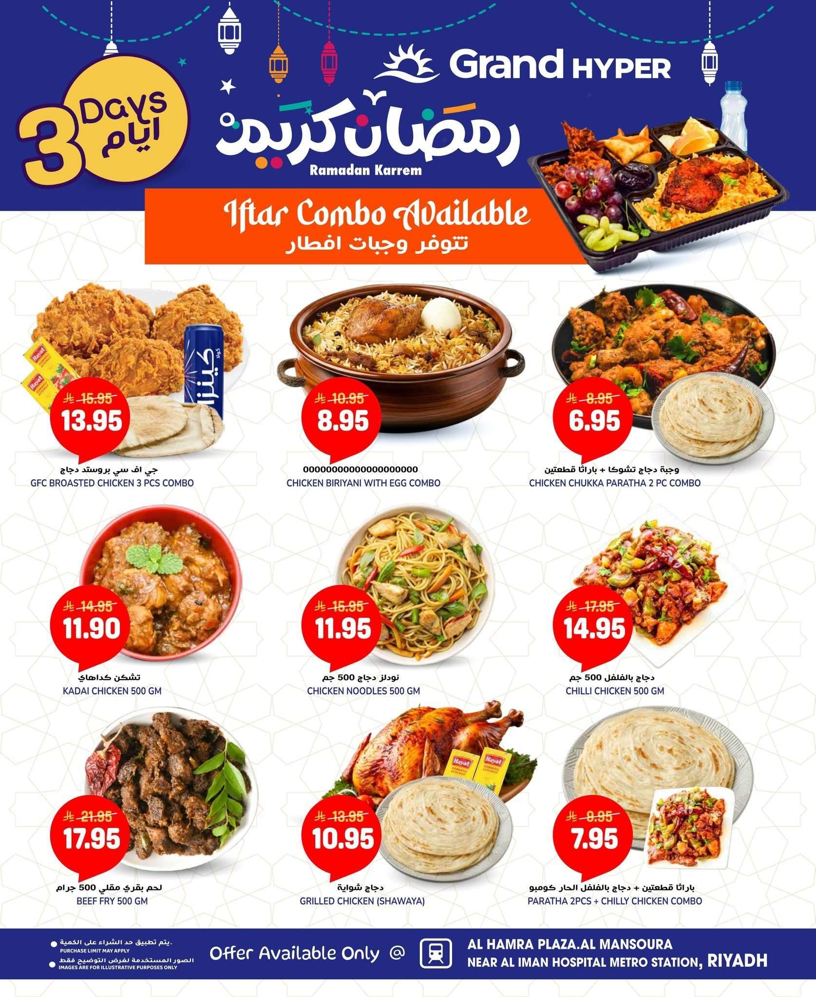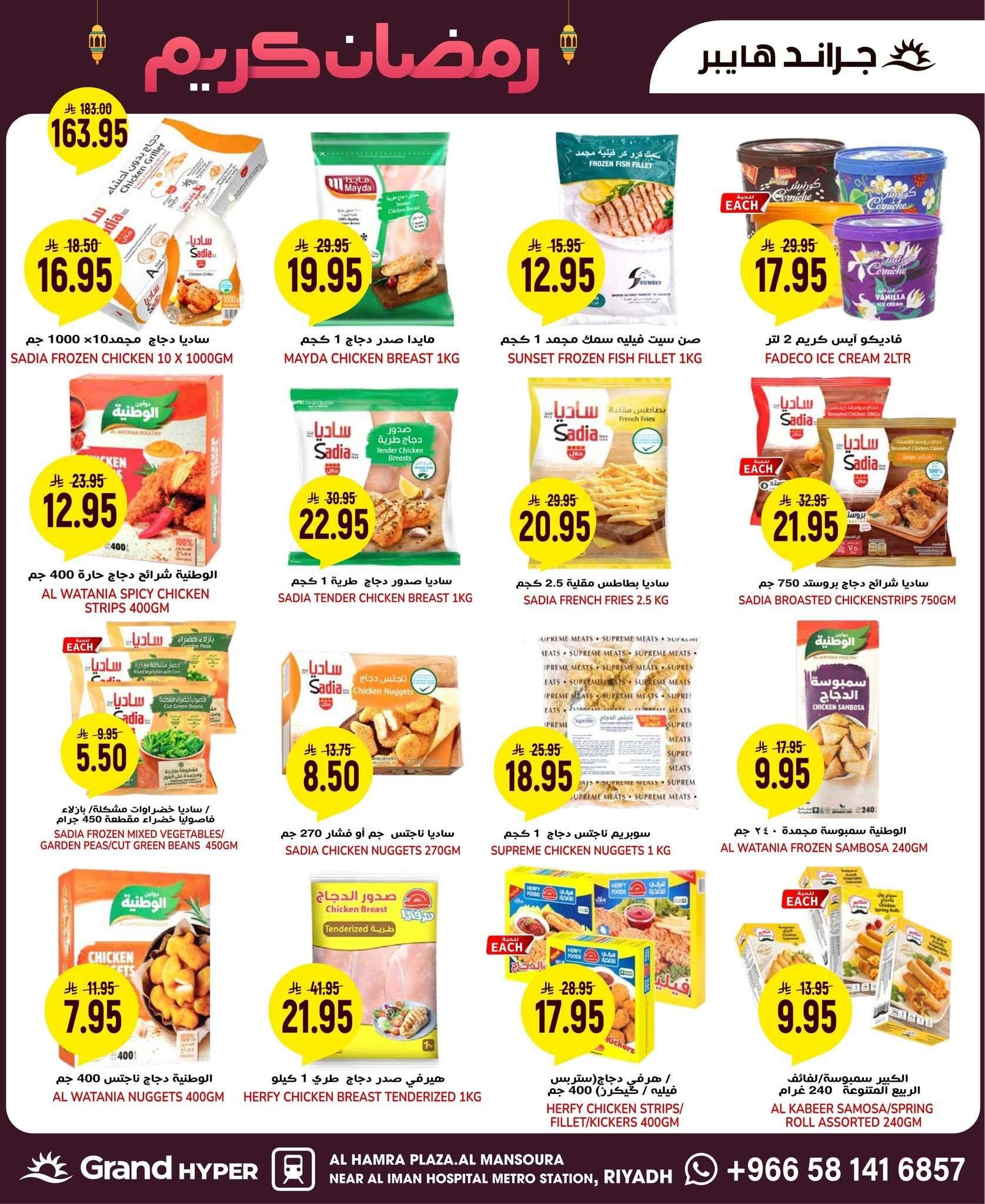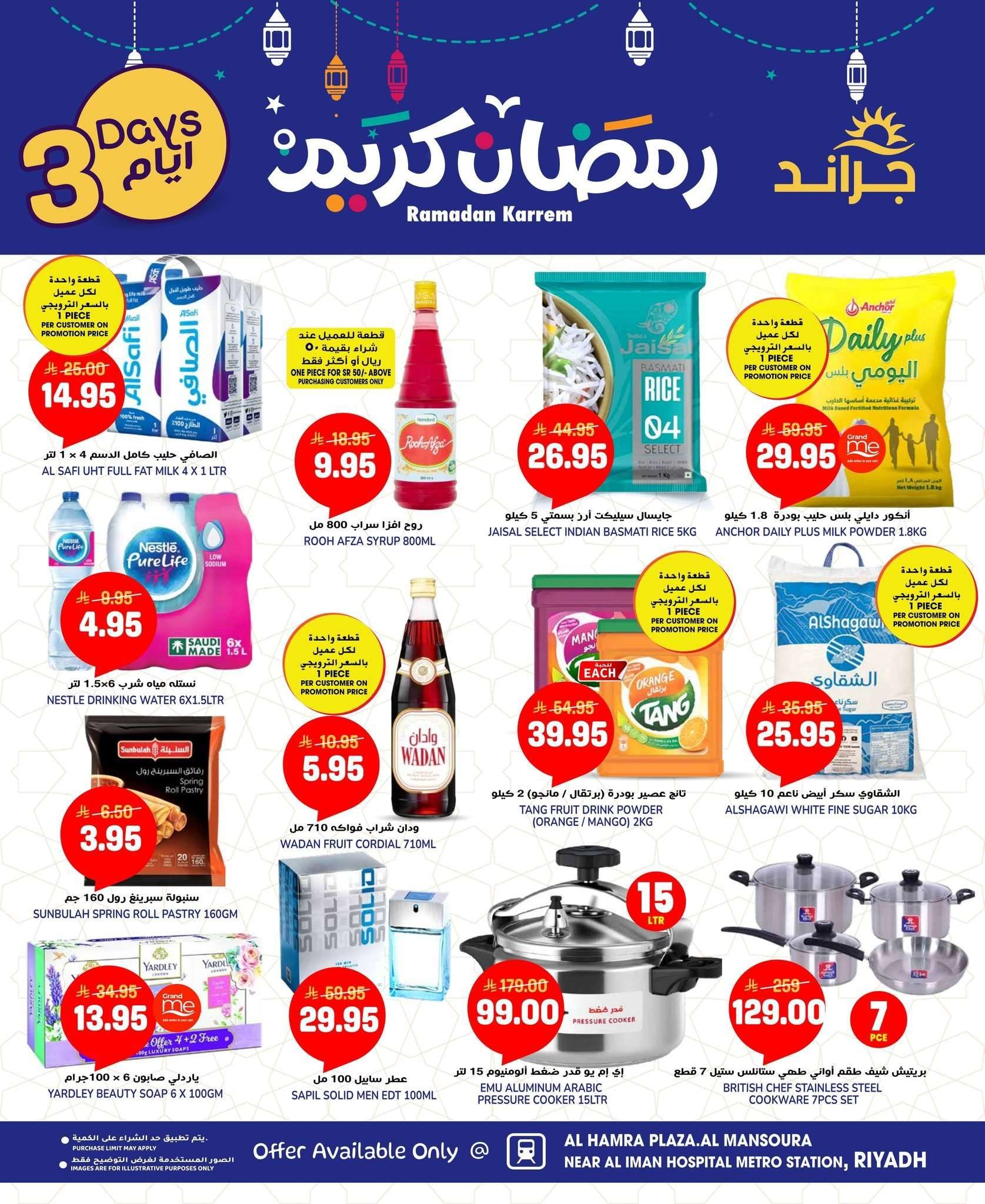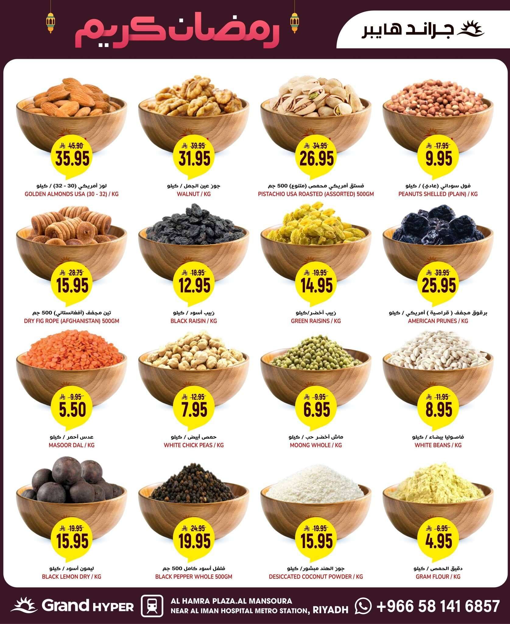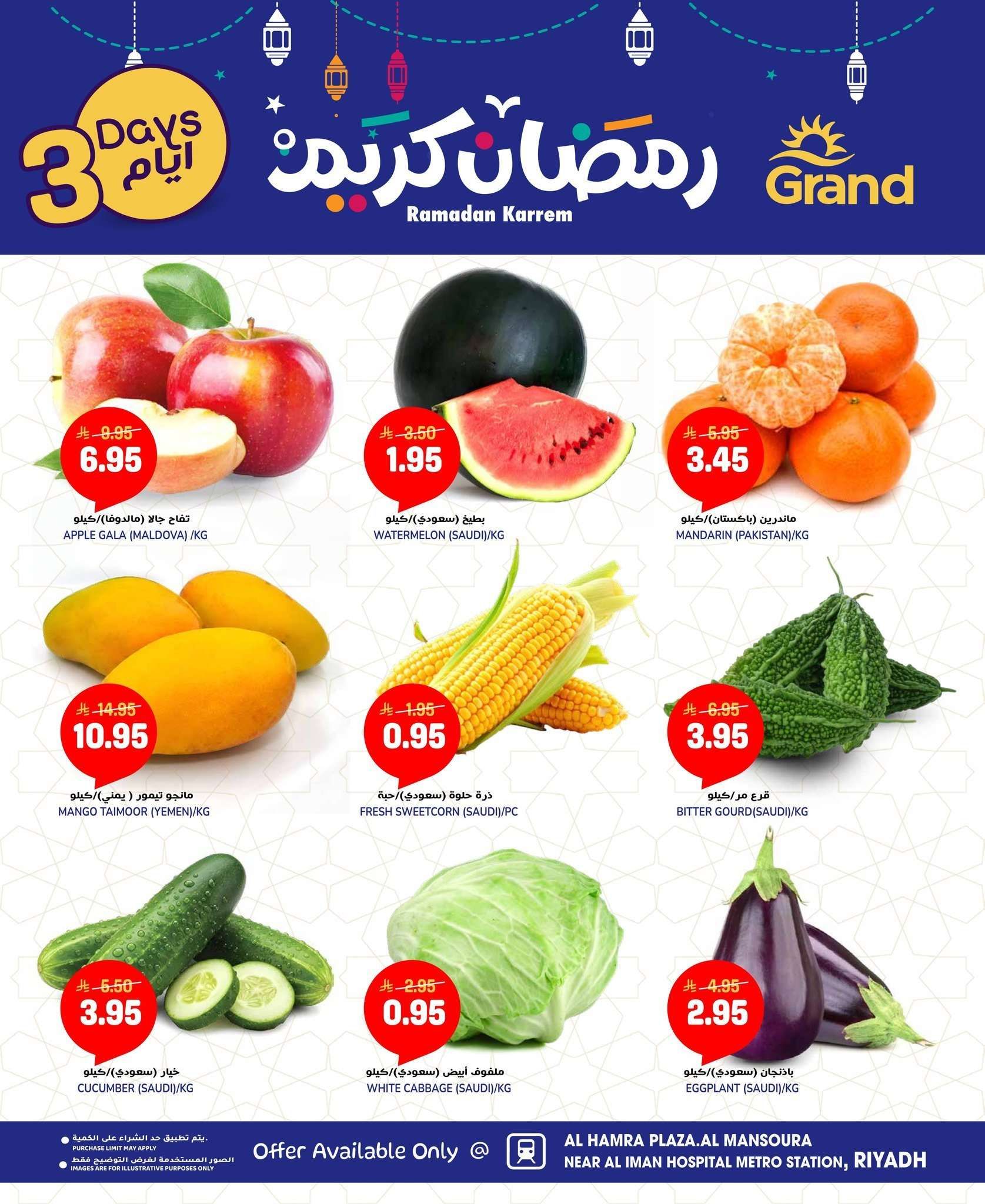 كما تشمل عروض جراند هايبر الرياض اليوم علي الخضروات والفواكه الأساسية والمواد التموينية كالأرز والزيت والدقيق ومستلزمات التنظيف والأجهزة المنزلية بالإضافة إلى المخبوزات والحلويات الرمضانية