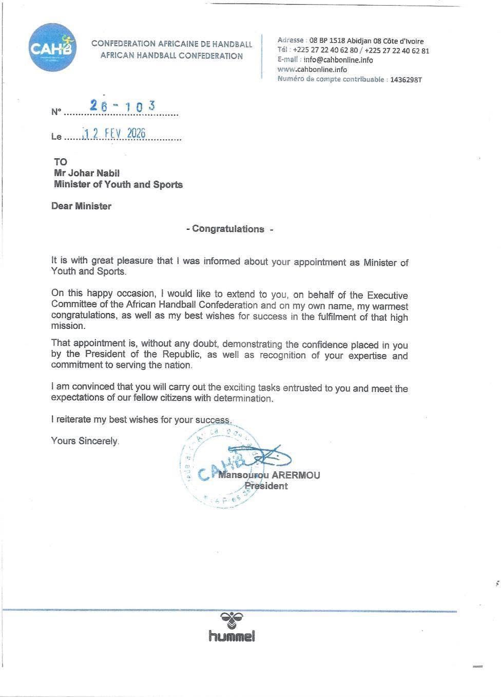 الأحد، 15 فبراير 2026 11:56 صحرص الاتحاد الأفريقي لكرة اليد، برئاسة منصور أريمو، على تهنئة جوهر نبيل بمنصب وزير الشباب و الرياضة في التعديل الوزاري الجدي، خاصة أنه أحد أبرز نجوم اللعبة في التسعينيات.
