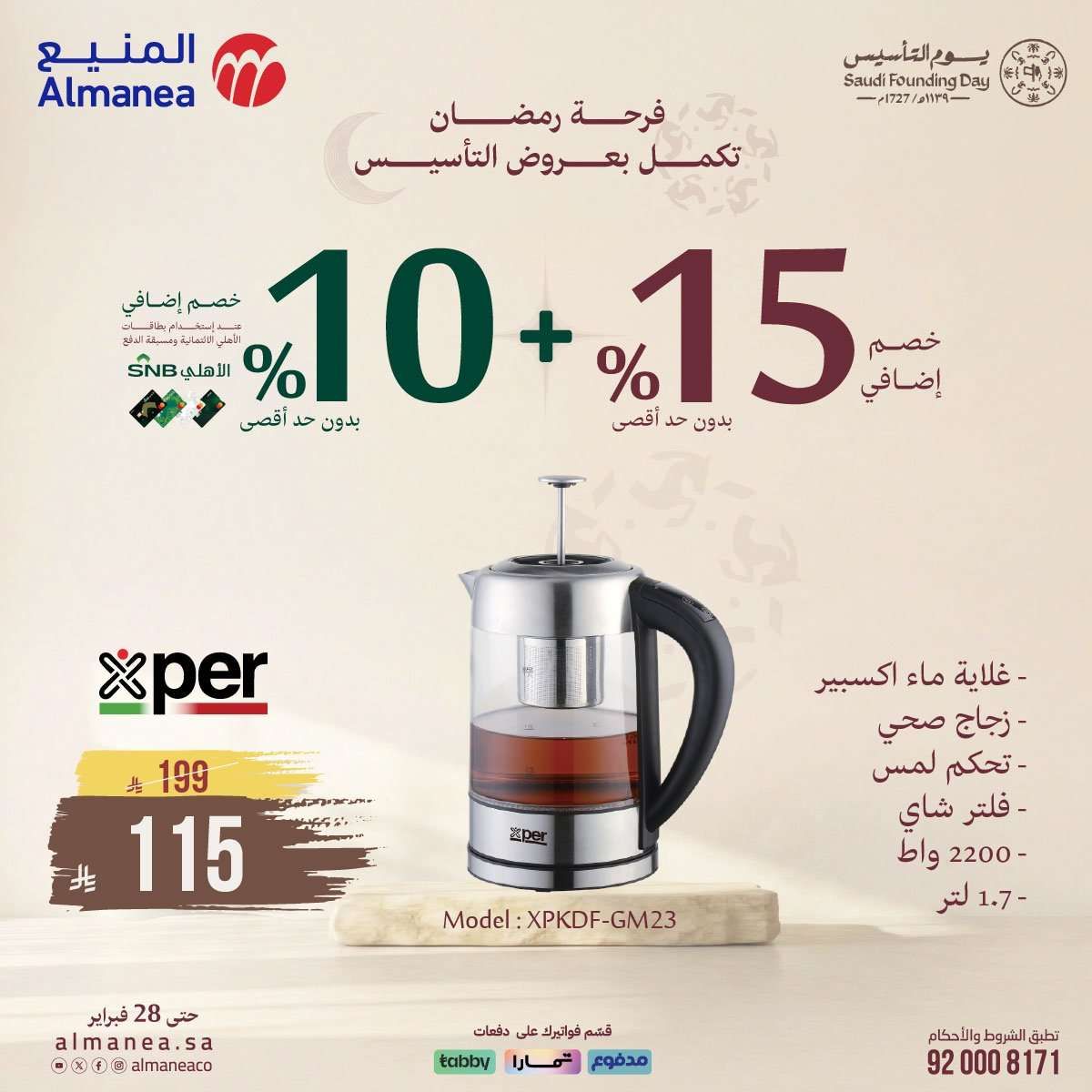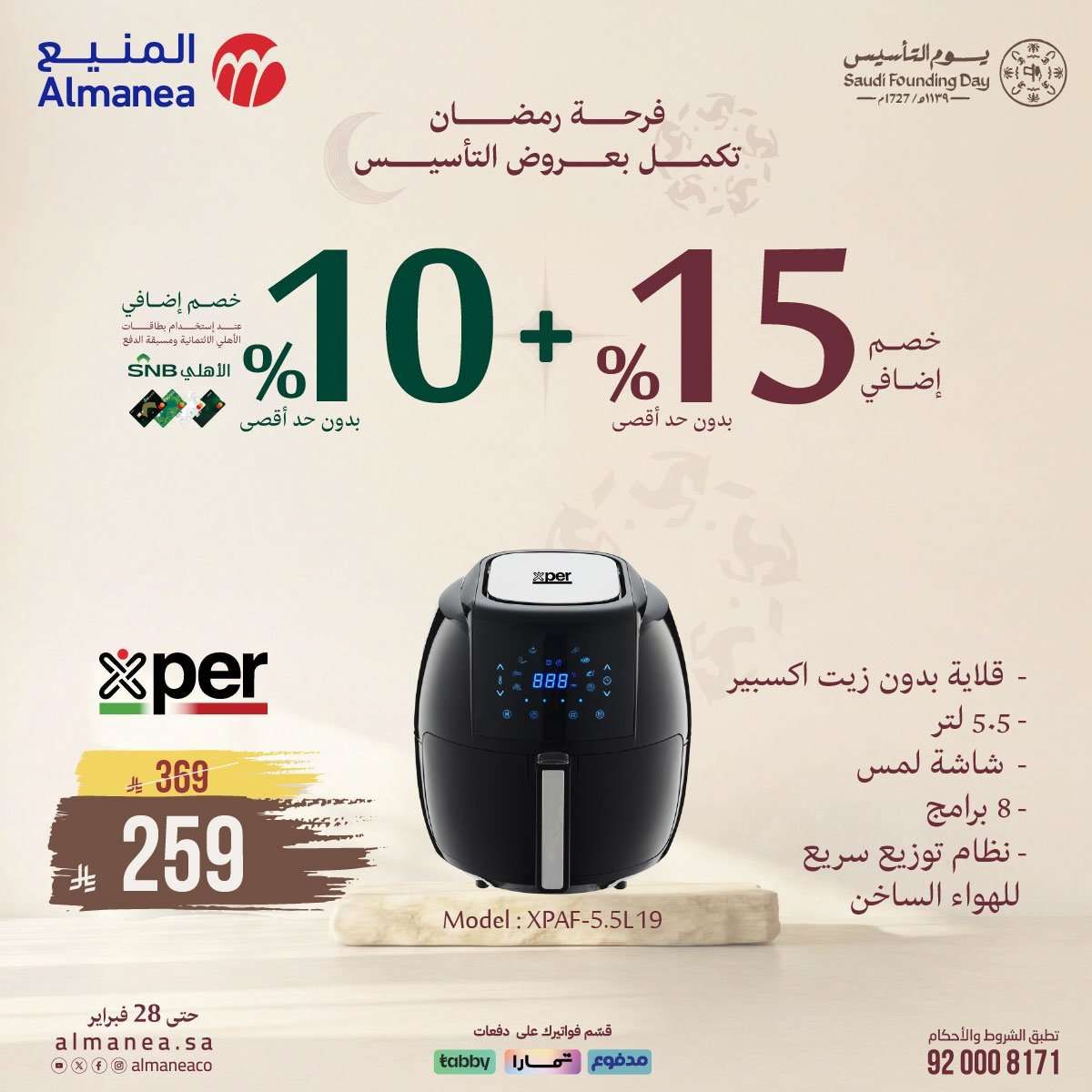 عروض المنيع مستمرة حتي السبت 28-2-2026 الموافق 11 رمضان 1447 و تحتوي علي تشكيلة واسعة من الأجهزة المنزلية بمناسبة يوم التأسيس وقرب رمضان تضم ثلاجات ونشافات ملابس وشاشات ذكية كبيرة