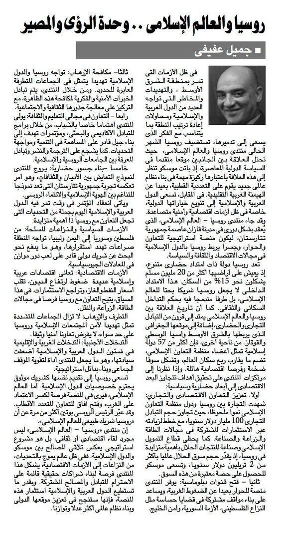 وجّه الكاتب المصري ومدير تحرير جريدة "الأهرام" جميل عفيفي رسالة في مقال نشر بالجريدة تحت عنوان "روسيا والعالم الإسلامي..وحدة الرؤى والمصير" موجّهة إلى الرئيس الروسي فلاديمير بوتين.
