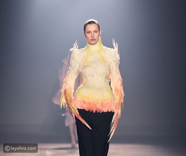 - الريش الذي غطى المعاطف والسترات، محولًا التصاميم إلى كائنات خيالية بين الأزياء والوحوش الأسطورية.