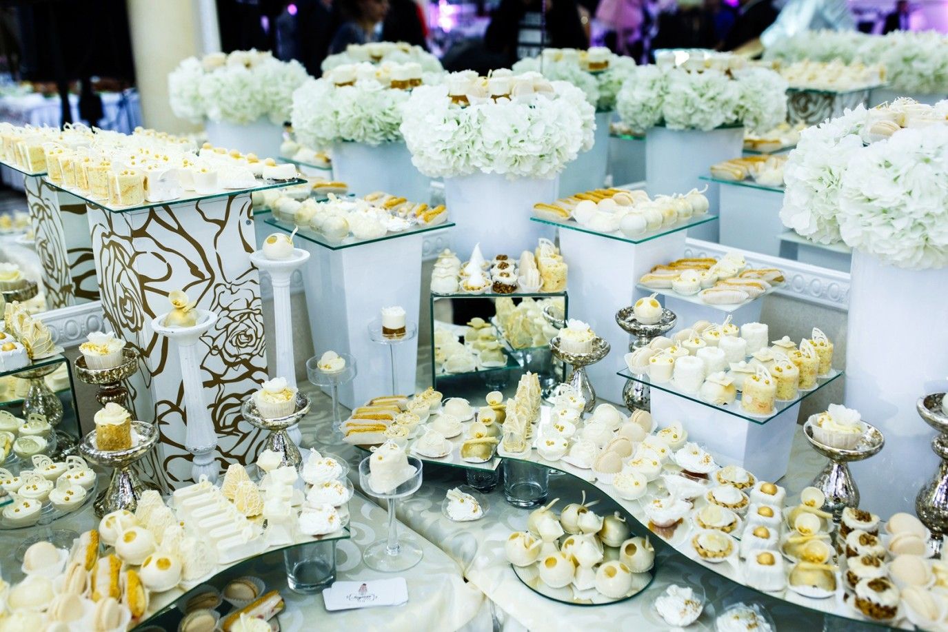 - قد يفضل بعض المصممين إضافة لمسة عصرية من خلال اختيار طاولات زجاجية أنيقة، وحلويات بيضاء أو بألوان الباستيل، مع ترتيب الزهور بطريقة متناسقة لجعل الحلوى نقطة الجذب.
