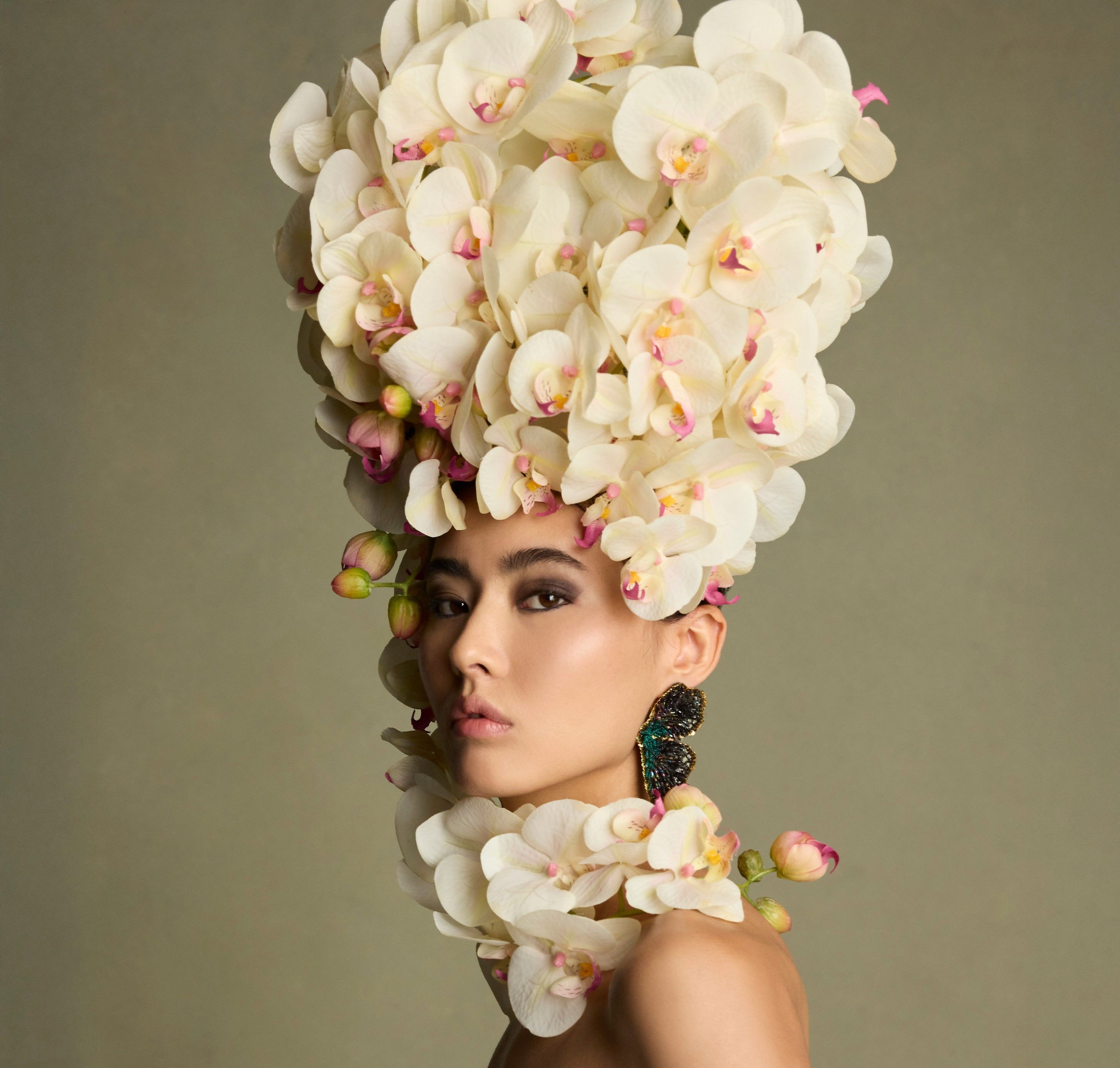 مكياج سموكي أسود ناعم مع الشعر المغطى بالورود بأسلوب ضخم