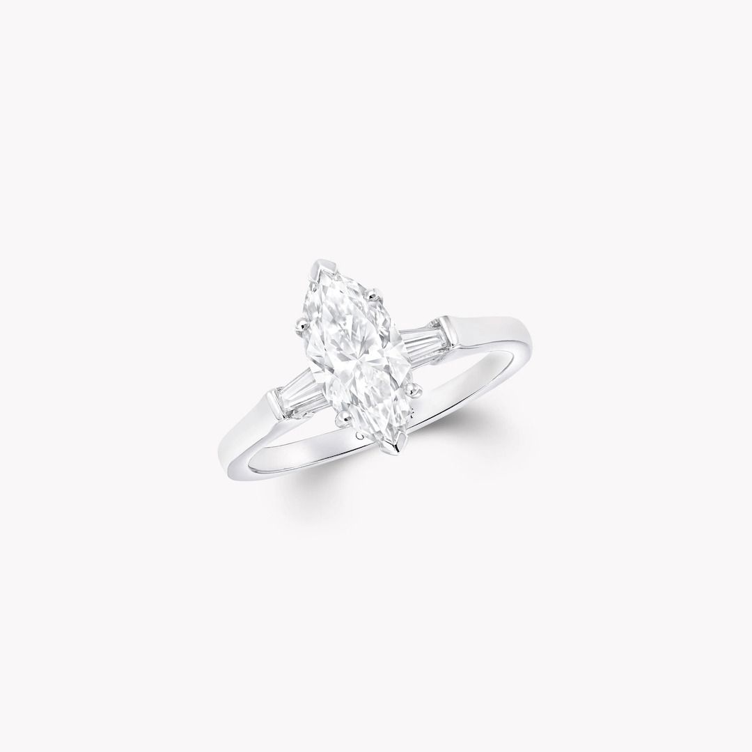 يُعتبر خاتم الخطوبة Promise من غراف Graff بتناغمه المثالي وبريقه الأخاذ مثالاً راقياً على الجمال الهندسي والدقة في الصياغة. يأتي التصميم في قالب من البلاتين الخالص، تتوزع على جانبيه أحجار ألماس مقطوعة بشكل باغيت متدرج، لتقود العين بانسيابية نحو حجر ألماس مركزي بقطع ماركيز، يتميز بشكل بيضوي جذاب ينتهي بنقاط متقنة التناسق.