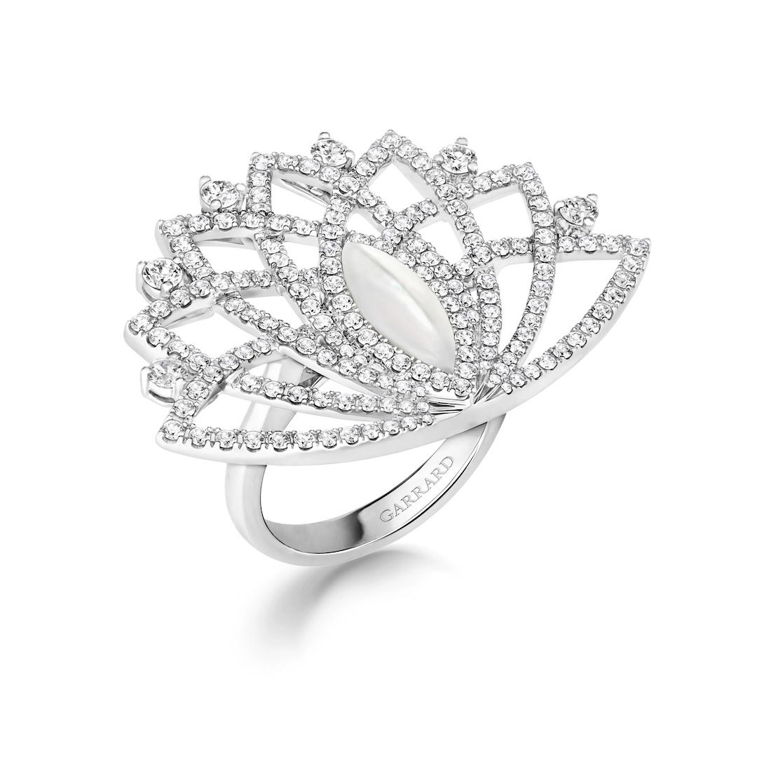 يتفتح جمال هذا الخاتم الأخَّاذ من غارارد Garrard من قلب حجر عرق اللؤلؤ المصقول بتقنية الكابوشون، حيث تنطلق “بتلات” من الألماس صُورت على شكل قطع الماركيز صعوداً فوق اليد في حركة نابضة بالحياة، تعكس روح زهرة اللوتس ورمزيتها العميقة.