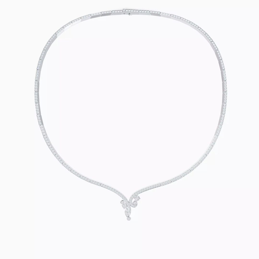 يعكس هذا العقد من دي بيرز De Beers الرمزية الخالدة للوردة الدمشقية، بتصميم ينبض شاعريةً وحركة مع كل التفاتة. صيغ العقد ليقتنص الضوء بانسيابية مذهلة، حيث يزدان بما يقارب 4.26 قيراط من أحجار الألماس بقطع الماركيز والقطع المستدير اللامع، في محاكاة راقية لبراعم الورود حديثة تتسلق حول ساقٍ طويلة بكل نعومة ورقة.