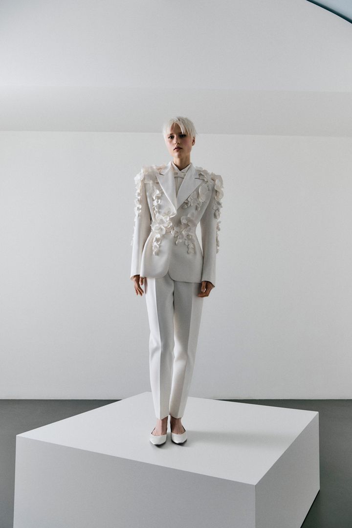 إذا كنت تبحثين عن إطلالة عملية لا تقيد حركتك من دون التضحية بمستوى الفخامة الذي تحلمين به في ليلة العمر، فأنت بحاجة إلى التفكير في البدلات الفخمة التي أدرجها المصممون في مجموعات خريف 2025 و2026، لا سيما البدلة عريضة الكتفين المزدانة بورود ثلاثية الأبعاد من فيكتور آند رولف Viktor & Rolf، والتي نرشحها للعروس النحيفة، ويمكنها تنسيقها مع أقراط Studs من الذهب الأبيض المرصع بالألماس واللؤلؤ، على أن يكون الحذاء Slingback أبيض أو فضيًا.