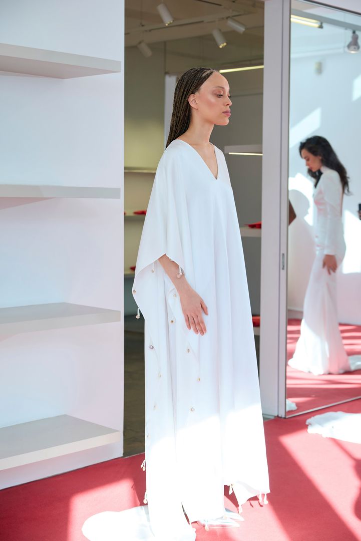 اعتدنا أن نرى القفاطين الواسعة تزين منصات عروض الأزياء الجاهزة والكوتور، ولكن أن يقدمها المصممون ضمن مجموعات فساتين الزفاف، هذا هو الجديد الذي يغازلون به ذوق العروس العربية، ستحبين مثلنا القفطان الأبيض المصمم بقصة البونشو أو الكاب والمميز بالياقة الـ V Neck من مجموعة فساتين زفاف Scorcesa لخريف 2026، ما رأيك في تنسيقه مع أقراط الثريا الكبيرة والمرصعة لتكتمل أناقتك الشرقية، وانتعلي حذاء أبيض مطرزًا لتضفي لمسة فخامة على قفطانك السادة.