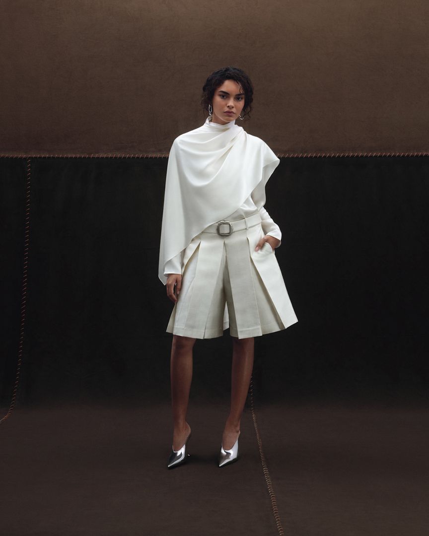 اكسري المألوف وتبني واحدة من الأفكار الجريئة التي قدمتها لنا مجموعات فساتين الأعراس لموسم خريف 2026، فلا تترددي في ارتداء الشورت الـ Tailored الأبيض الطويل في يوم زفافك خاصة إذا كنت تخططين لحفلة منزلية، قدمت لنا ماركة Lein مثالاً رائعاً لهذا الستايل حيث ظهرت العارضة بشورت واسعة يلامس الركبة بالكاد نسقته مع توب ووشاح كبير يلف الجزء العلوي من الجسم، تممي هذه الطلة بحذاء فضي على طريقتها، وزيني أذنيك بأقراط Hoops.