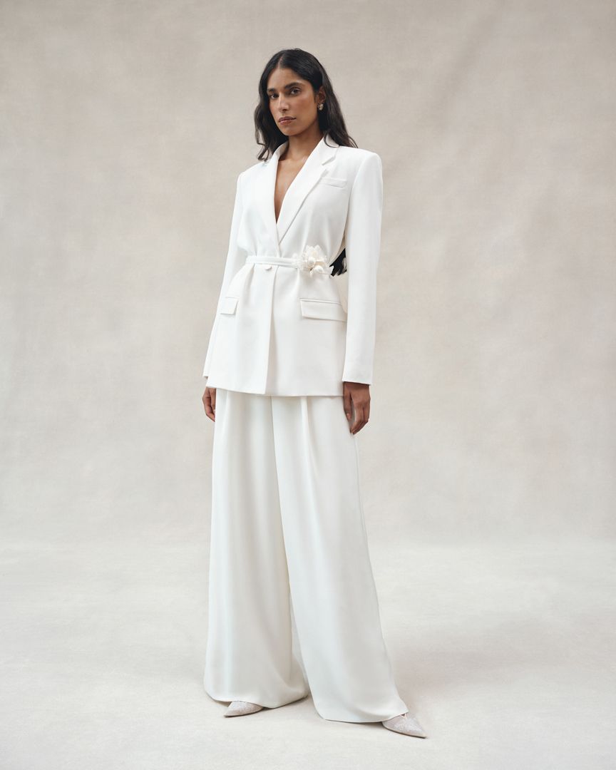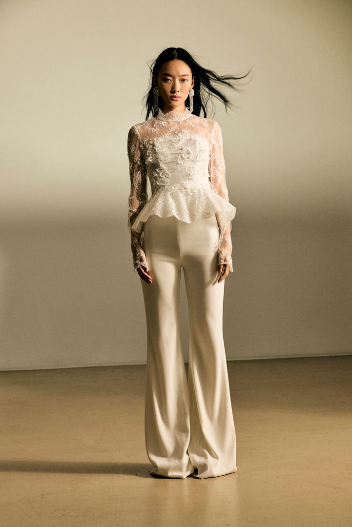 يثبت الجمبسوت موسماً بعد موسم حضوره الأنيق كبديل لفستان الزفاف، فهو ثاني قطعة تفضلها العروس العصرية بعد البدلات، لذا أدرجه المصممون بتصميمات منوعة في مجموعات 2026 التي تابعناها قبل أسابيع قليلة، من جهتنا أحببنا الموديل المصمم بتوب بيبلوم دانتيل وبنطلون سادة واسع من تشكيلة ماركة Kaviar Gauche، ونظراً لكونه مصمماً بياقة عالية سننصحك بالاكتفاء بتنسيقه مع أقراط متدلية متوسطة الطول، وانتعلي حذاء مدببًا أبيض سادة.