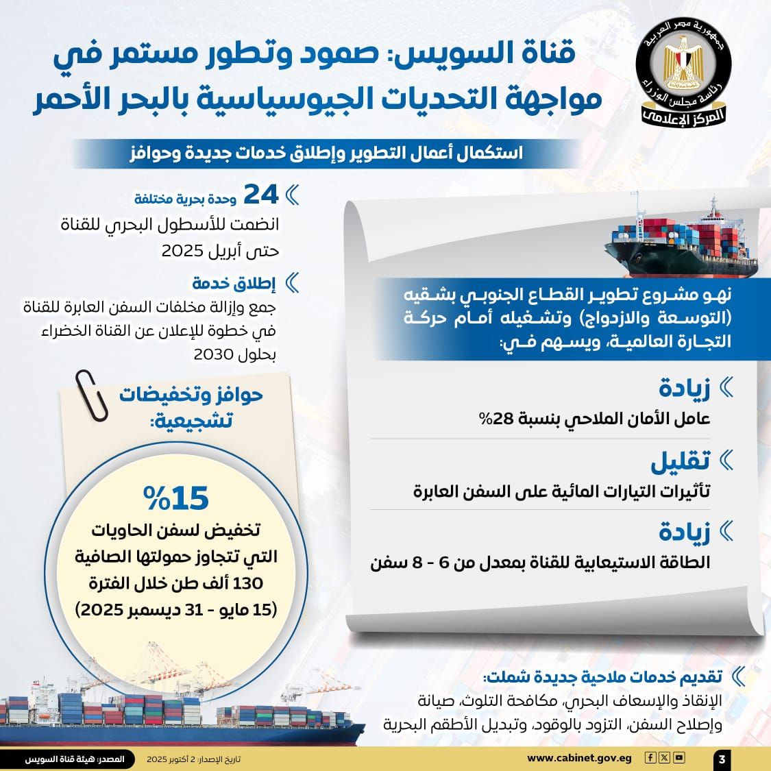 الخميس، 02 أكتوبر 2025 12:24 منشر المركز الإعلامي لمجلس الوزراء عددًا من الإنفوجرافات عبر منصاته على مواقع التواصل الاجتماعي، سلط من خلالها الضوء على الصمود والتطور المستمر لقناة السويس في مواجهة التحديات الجيوسياسية بالبحر الأحمر.