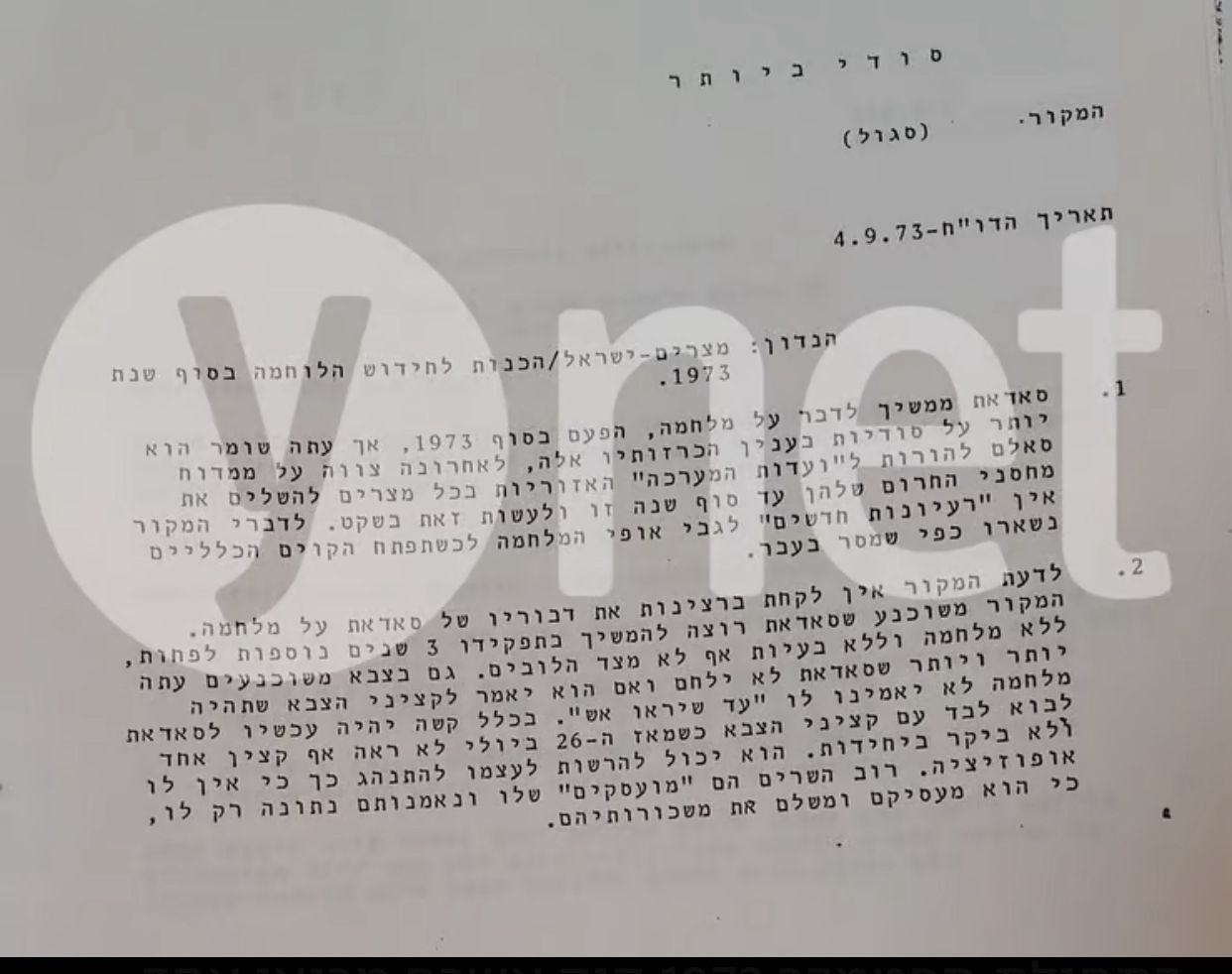 ونشرت الصحيفة الإسرائيلية عددا من الوثائق التي قدمها جهاز الموساد نقلا عن أشرف مروان منها رسالة بعنوان "مصر وإسرائيل .. الاستعدادات لتجدد الأعمال العدائية نهاية 1973"، مؤكدة أن هذا التقرير الذي أرسله أشرف مروان إلى الموساد في 4 سبتمبر 1973 بأن الرئيس أنور السادات يواصل الحديث عن أن الحرب في نهاية عام 1973، لكنه الآن أكثر تكتمًا بشأن هذا الأمر، ويقول مروان في البرقية التي أرسلت للموساد: السادات أمر مؤخرًا ممدوح سالم – وزير الداخلية آنذاك - بإصدار تعليمات لاستكمال مخازن الطوارئ الخاصة بها بحلول نهاية 1973 والقيام بذلك بهدوء".